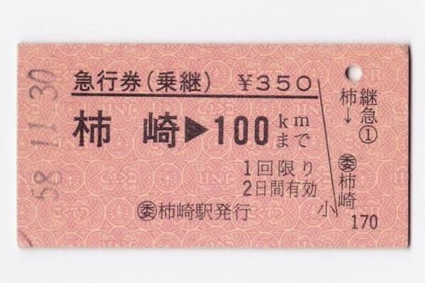 ●国鉄●(委)柿崎駅発行【柿崎→100kmまで 急行券(乗継)350円 ▲三角矢印 】A型券 昭和58年 【3753】