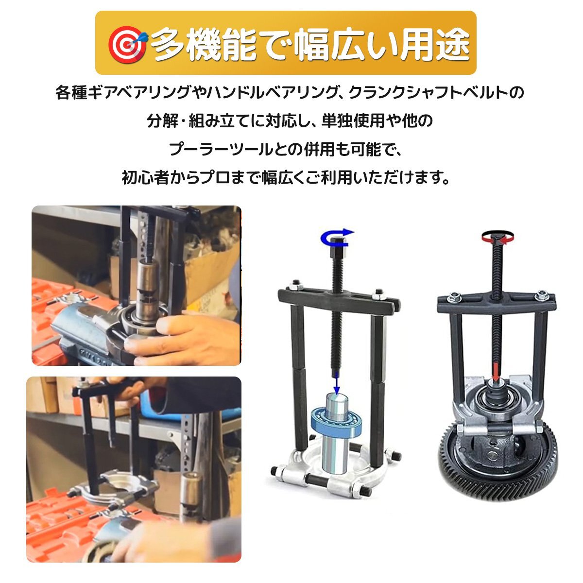 クランクシャフト、ハンドルベアリング、ギア、パイロットベアリングなどの脱着作業に使用可能。単体での使用だけでなく、他のプーラーとの併用もできます。