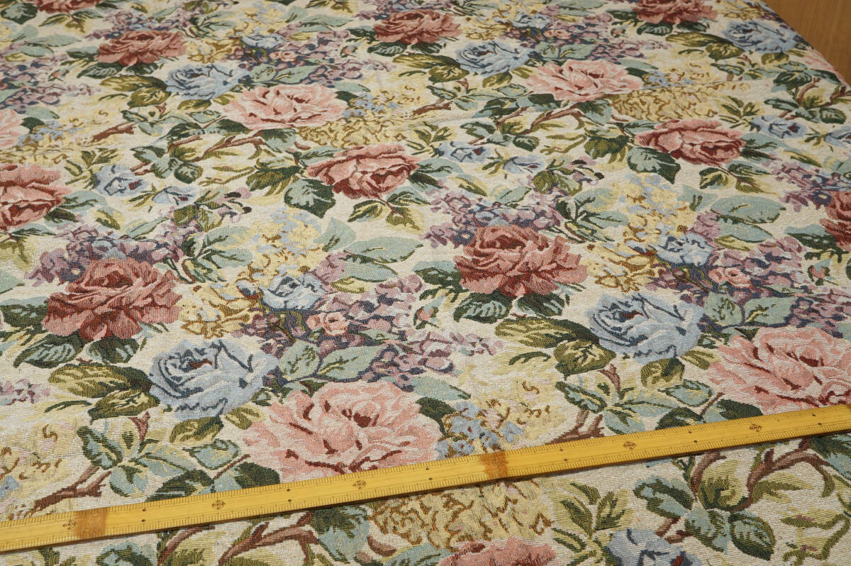 綿30%・ポリエステル70%、中厚~微厚、ややソフト系、程よいコシ、生地端と耳部分はオーバーロック仕様で、アンティークな雰囲気のやや大きめなバラと多色花柄でございます。