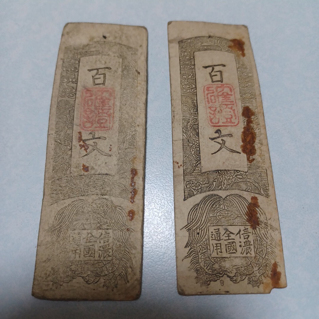 信濃全国通用札 百文です。 実家の箪笥の奥にしまってあったものです。 価値があるものなのかよくわかりませんが、価値がわかる方に購入をお願いしたいと思います。 先祖が持っていたものです。 藩は書いてなくて、なんとか局と書かれております。 塩尻?なのか。 もう一枚は藩と書かれていますが、上が読めません。 昔の財布の中でいろんな古銭と一緒になっていたのか。錆が札についてしまっております。 状態は写真でご確認をお願いいたします。 【早急部屋の片づけの為出品】売れない場合は価値がないものと判断し処分してしまう予定なので。必要であれば早めにご落札をお願いいたします。 」 | |||