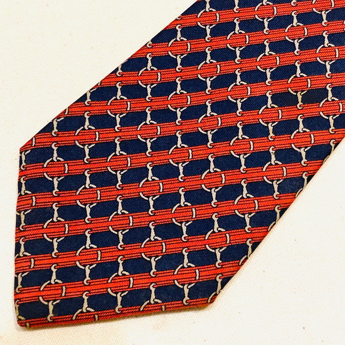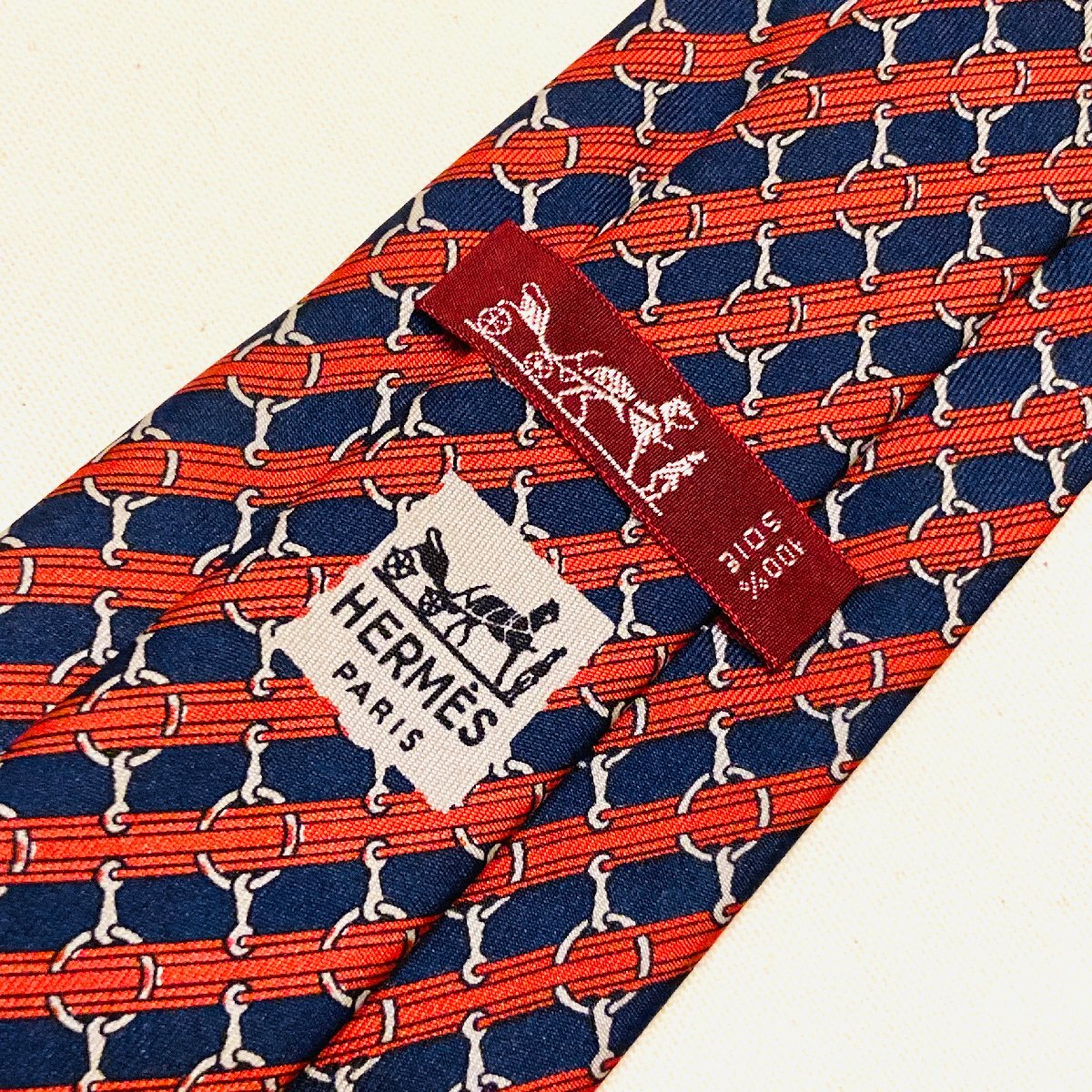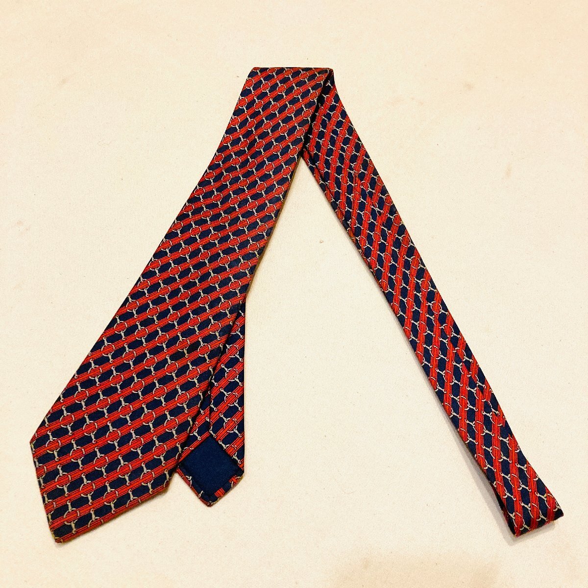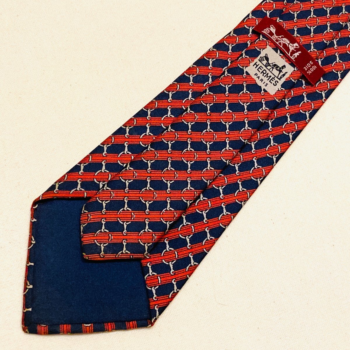 HERMES エルメス フランス製 絹 シルク SILK 100% 高級 ネクタイ レッド/ネイビー系 総柄 ストライプ 803MA