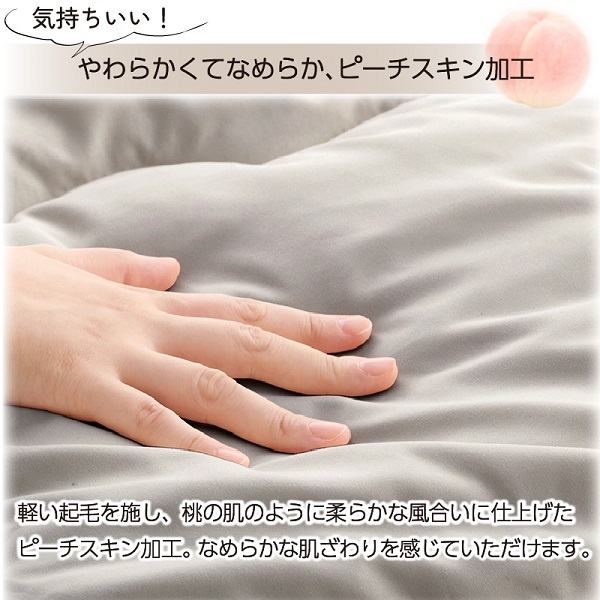 掛布団 <サイズ>150×210cm <充填量>約1.2kg <充填物>ポリエステル100% <側地素材>ポリエステル100%(ピーチスキン仕様) <ループ数> 6か所