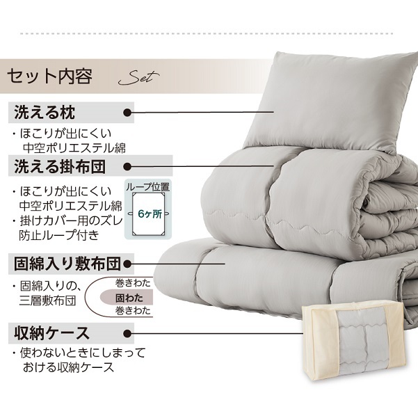 わたぼこりのでにくい中空ポリエステル綿を使用。 ふわっとしてニオイも少なく、丸洗いもできるので清潔です。 枕、掛布団、敷布団すべて洗えます。