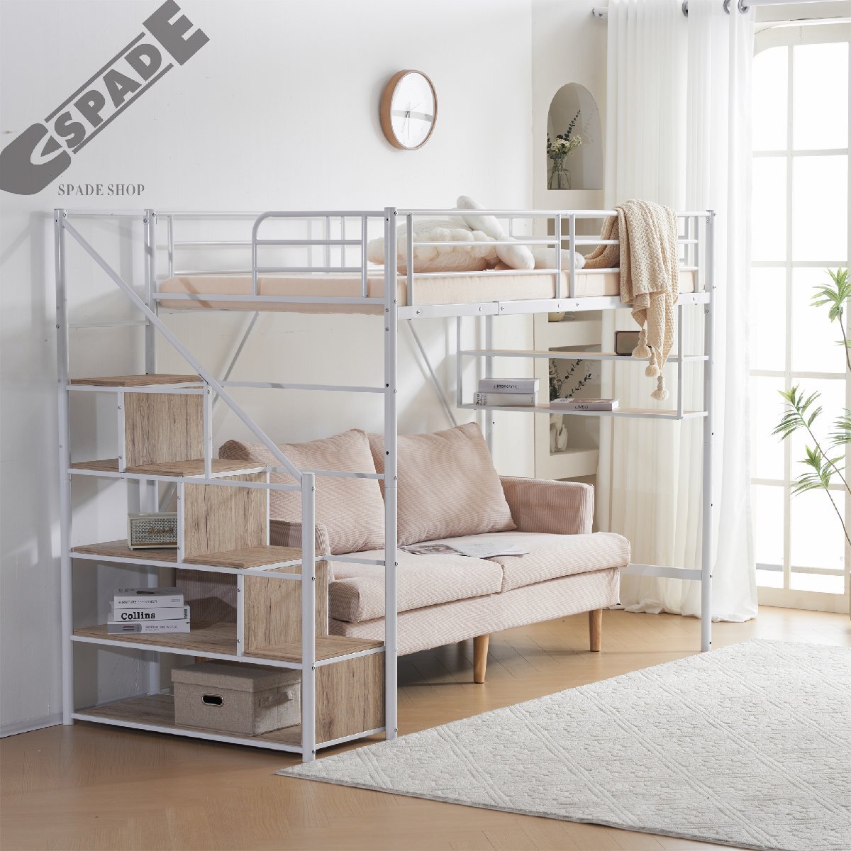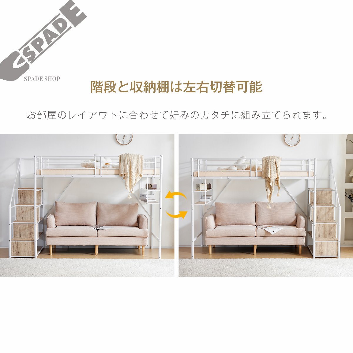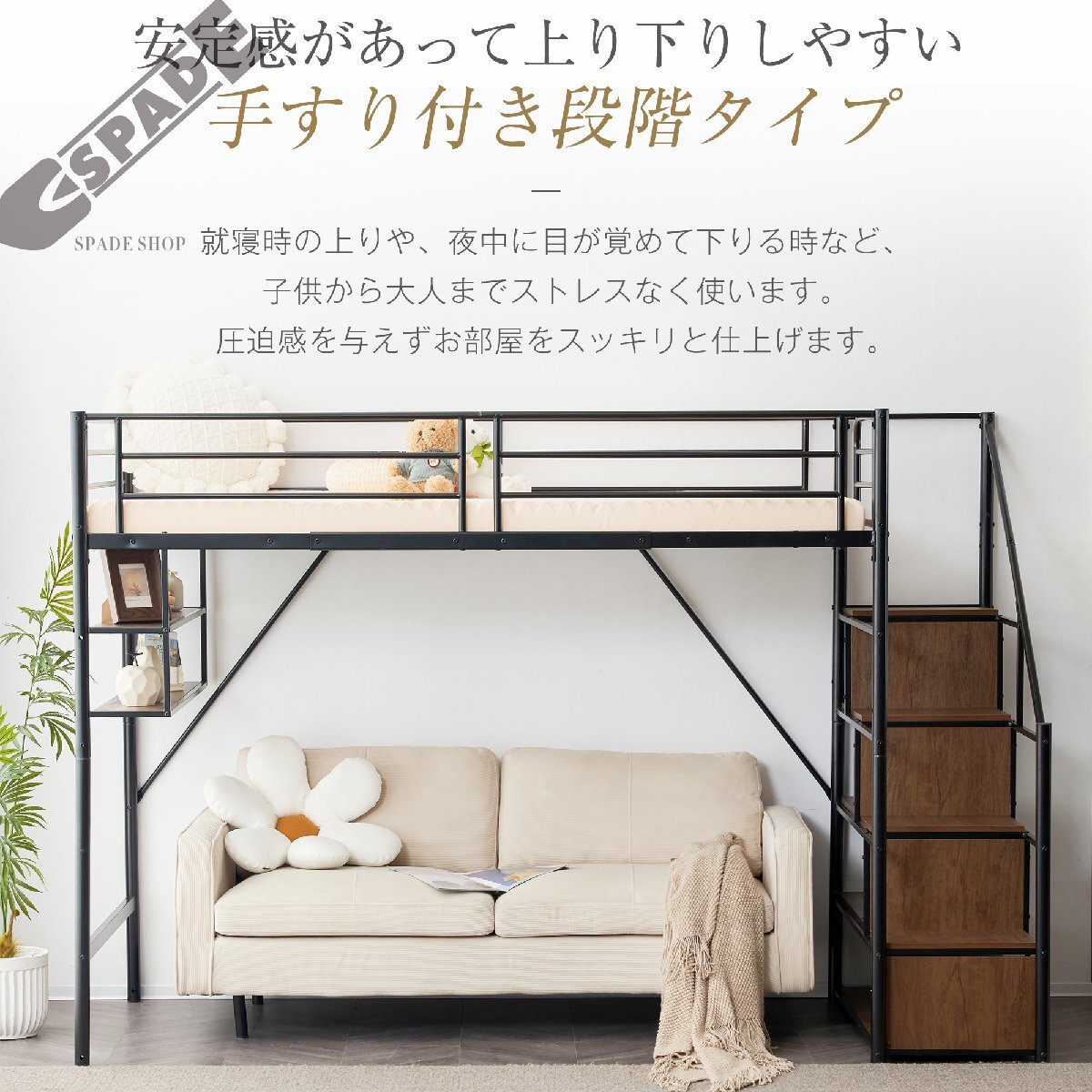 1.片側に手すりを設置したため、上りも下りも安定感抜群!さらに、階段は収納スペースとしても大活躍します。限られたスペースでも効率的な収納が実現し、本や写真を飾ってお部屋の雰囲気を演出できます。お部屋のレイアウトに合わせて、階段と収納棚を左右に自由に取り付けられるので、小さな部屋にも最適です。このロフトベッドはスマートな空間利用と魅力的なデザインを兼ね備え、快適で素敵な寝室環境を実現します。休息の場としてだけでなく、生活空間をより機能的に整理する一台として、多くの利点を持っています。空間を最大限に活用し、快適で整頓された寝室を実現します。