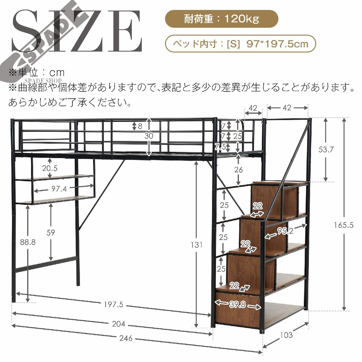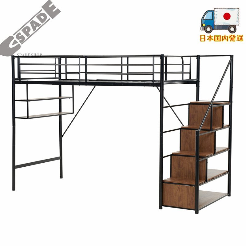 【国内発送】新作 ブラック ロフトベッド 片側手すり付き 収納付き パイプベッド シングルベッド 木 北欧風 子供部屋 スチール 耐震