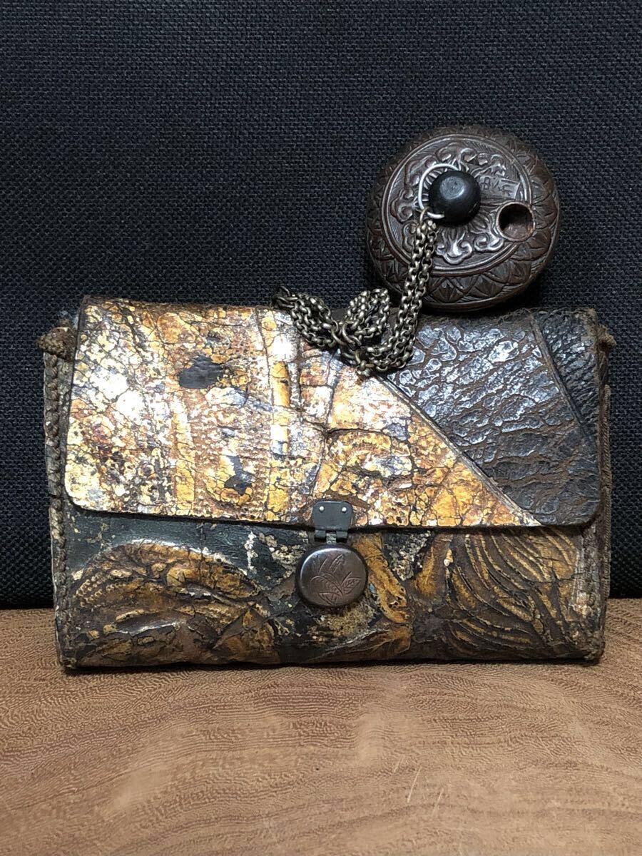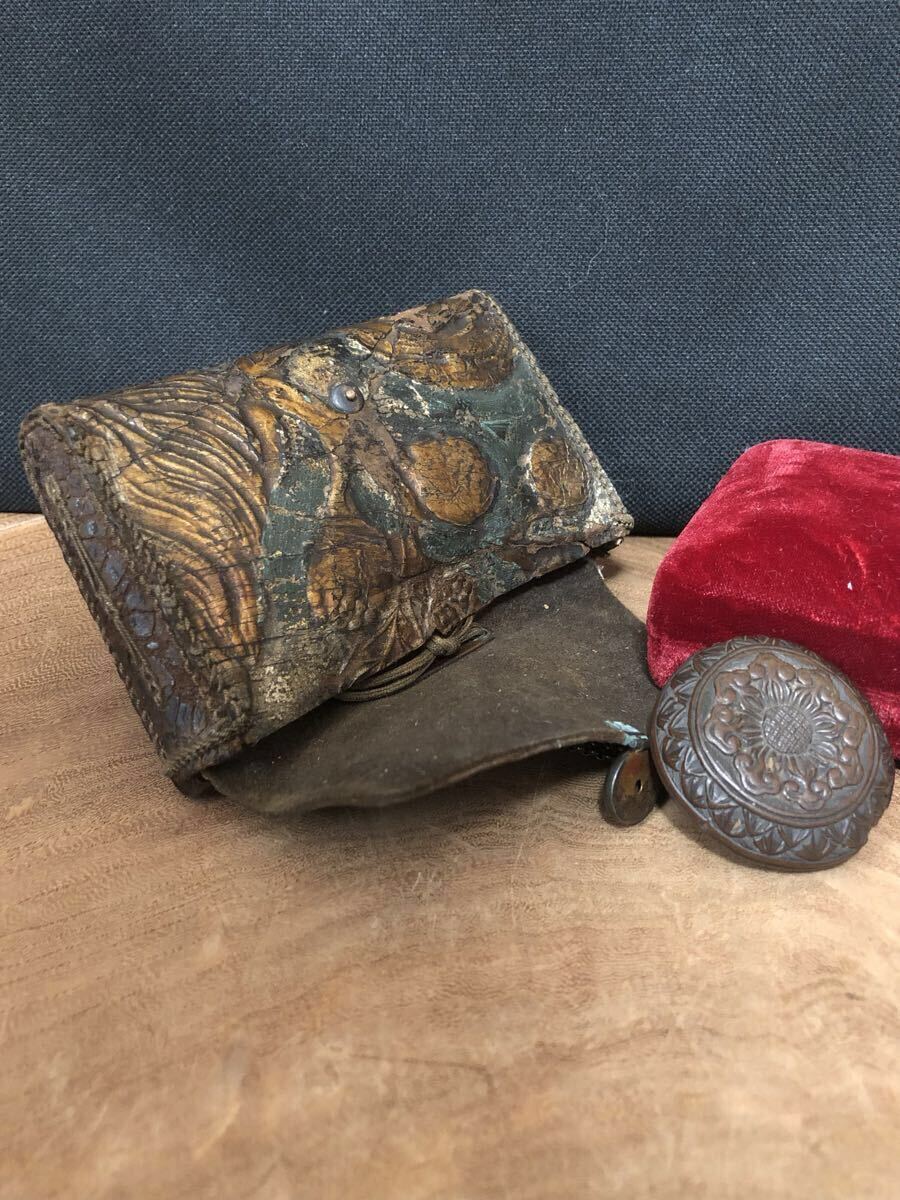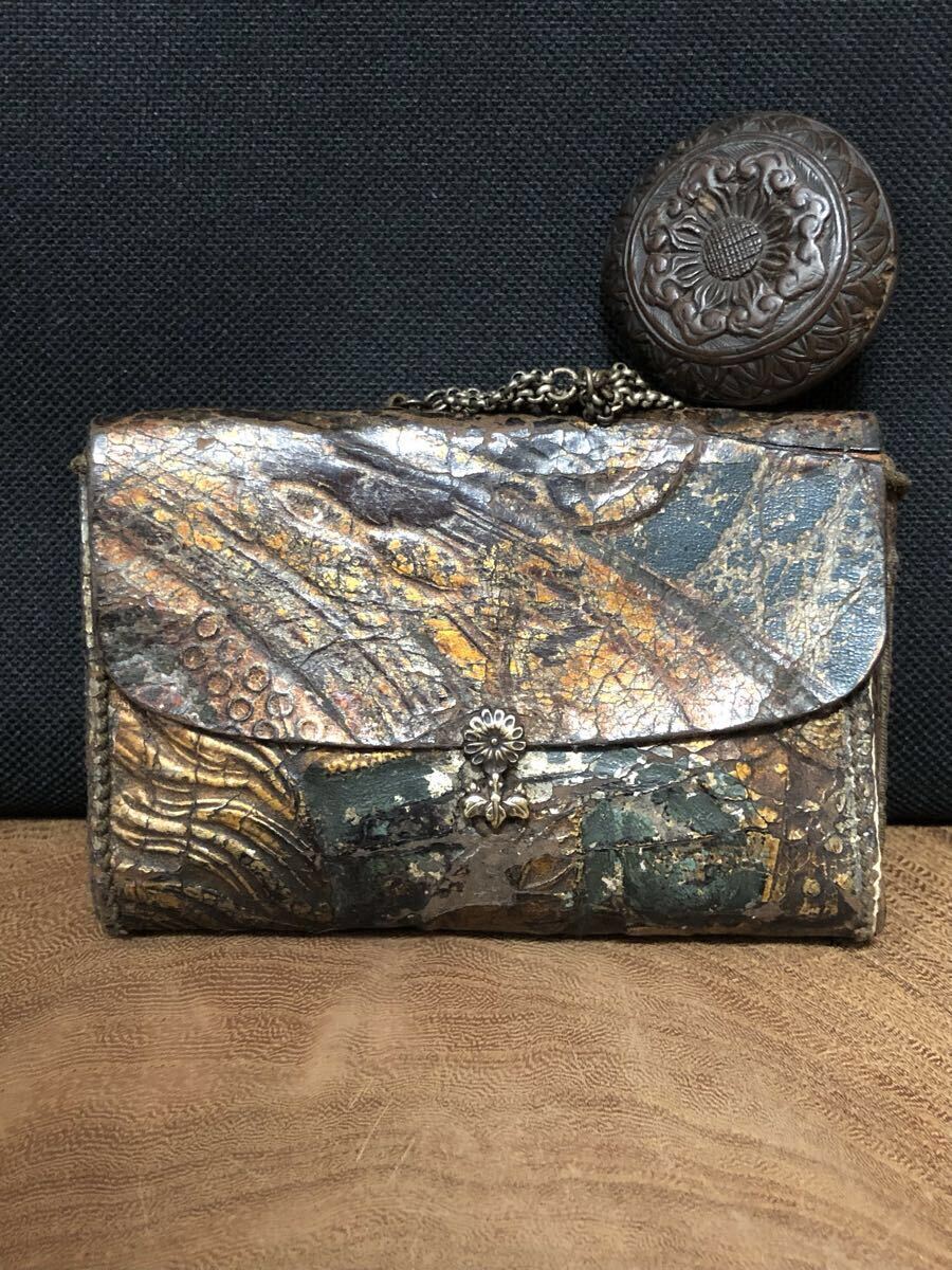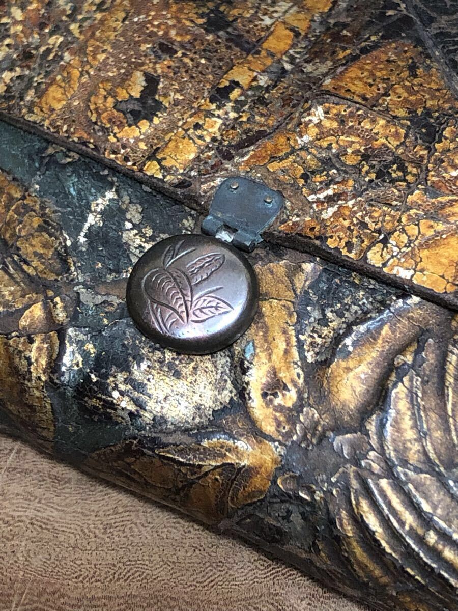 金唐革の煙草入で、両面それぞれに前金具が付いており、両面とも開く珍しい作りです。