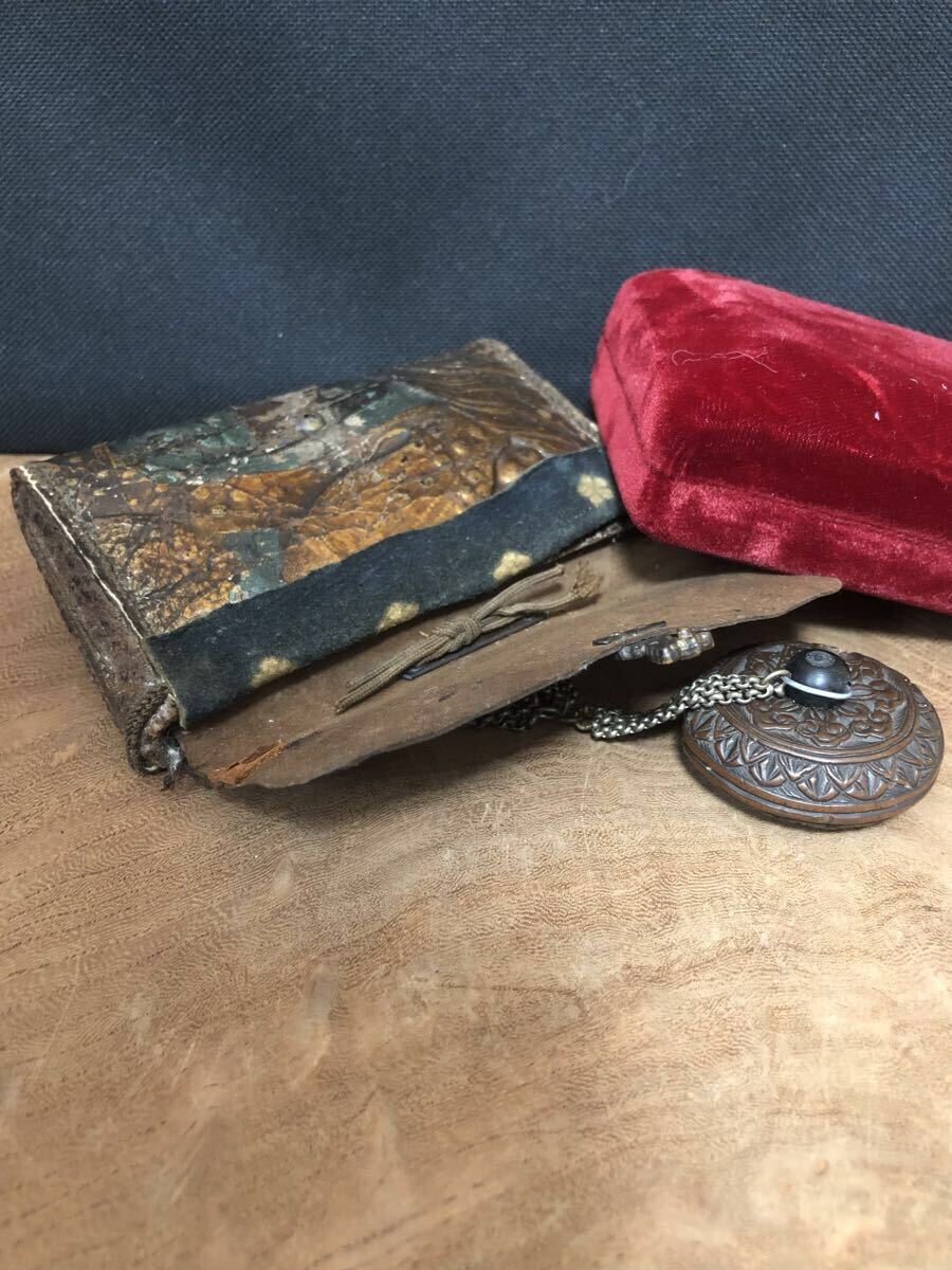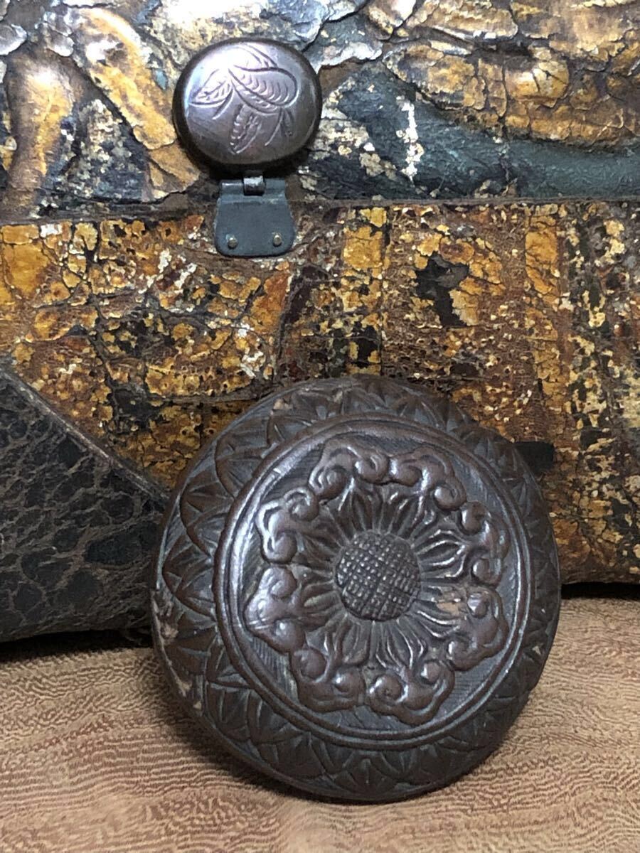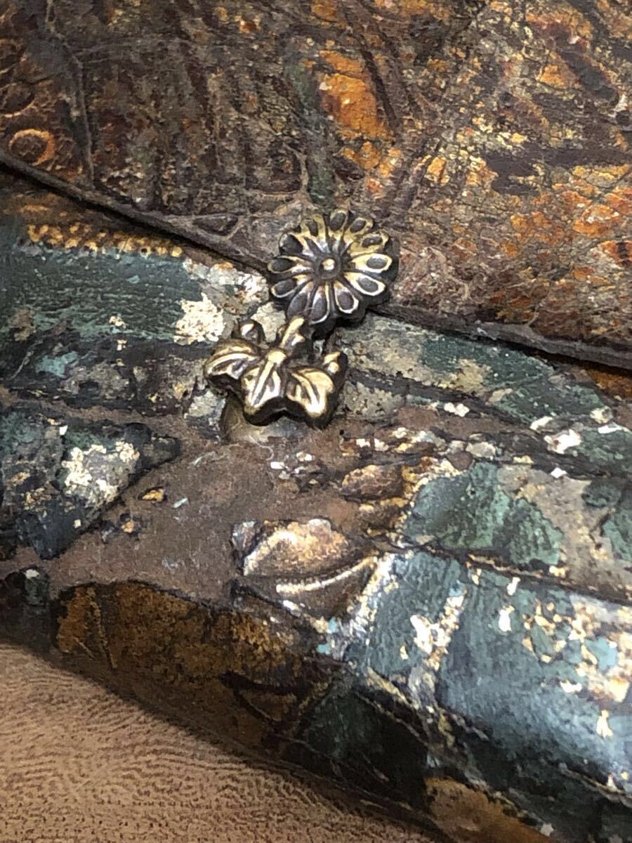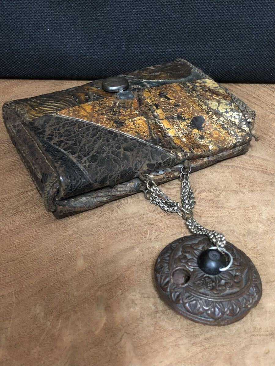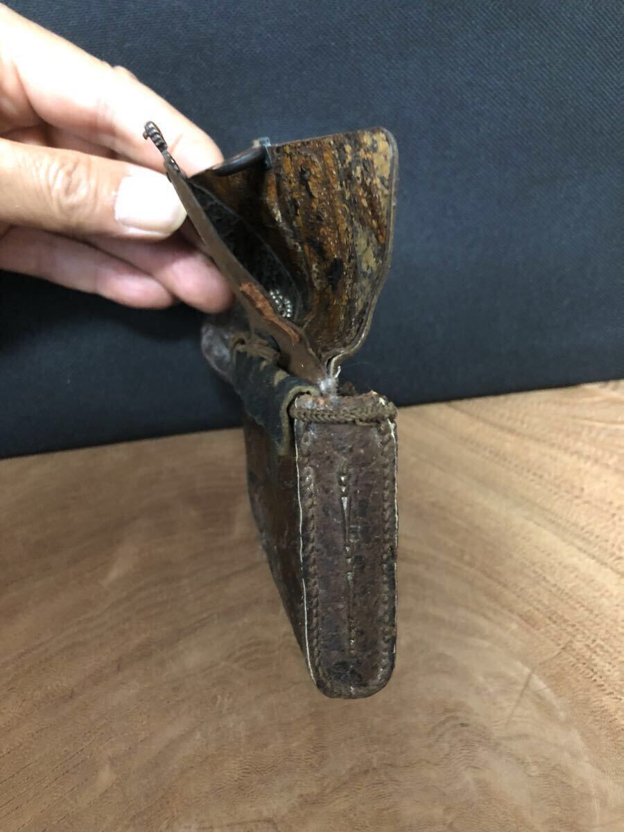 金唐革の煙草入で、両面それぞれに前金具が付いており、両面とも開く珍しい作りです。