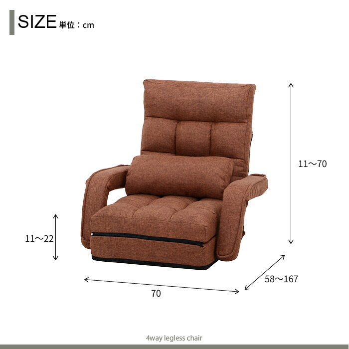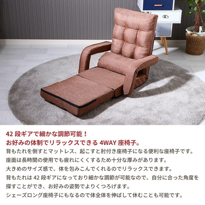 | 座ったり、寝転んだり、4つの使い方でリラックスできる座椅子。 42段ギアの細かな背もたれ調節ができ、自分に合った角度を探してお好みの姿勢でくつげます。 背もたれ、座面ともにボリュームたっぷり。 座面のクッションは取り外しができるので、別々に使うこともできます。 カラーはブラウン、グレー、ダークブラウン、ネイビーの4色展開。 |
