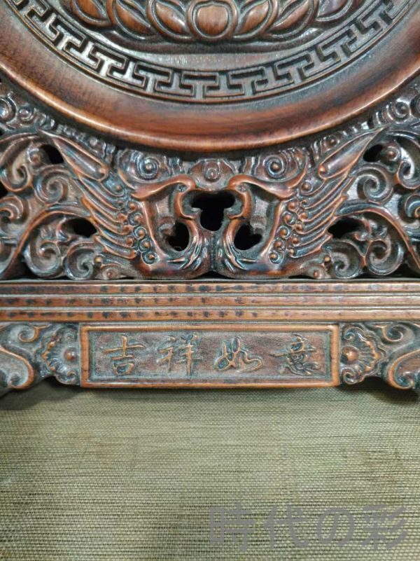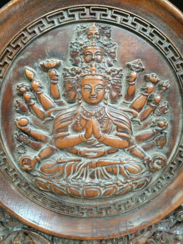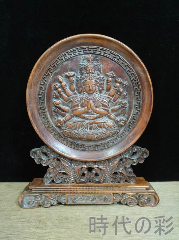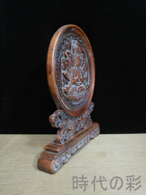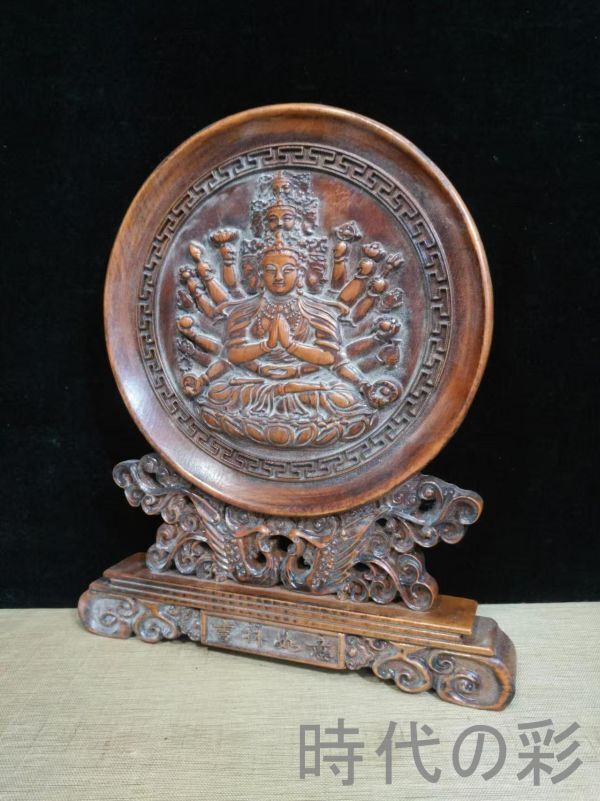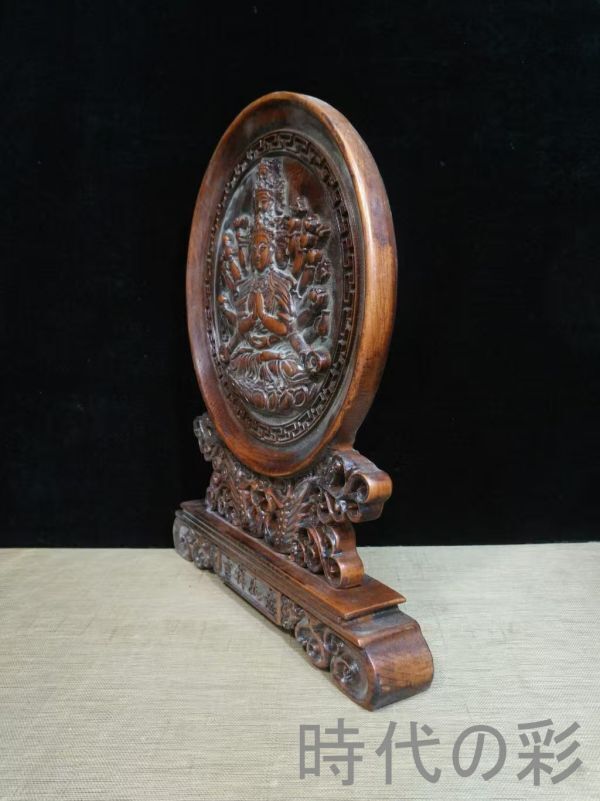 本品は黄花梨木製の座屏で、干手観音菩薩の精緻な彫刻が特徴です。平安や守護の象徴として、書斎や床の間に置いて鑑賞・収蔵可能です。
