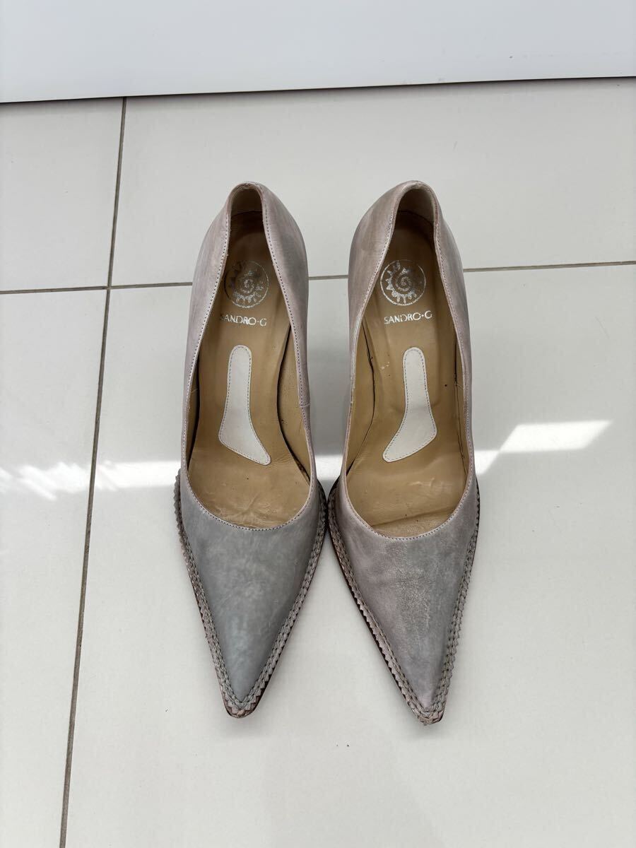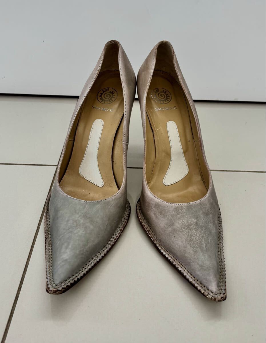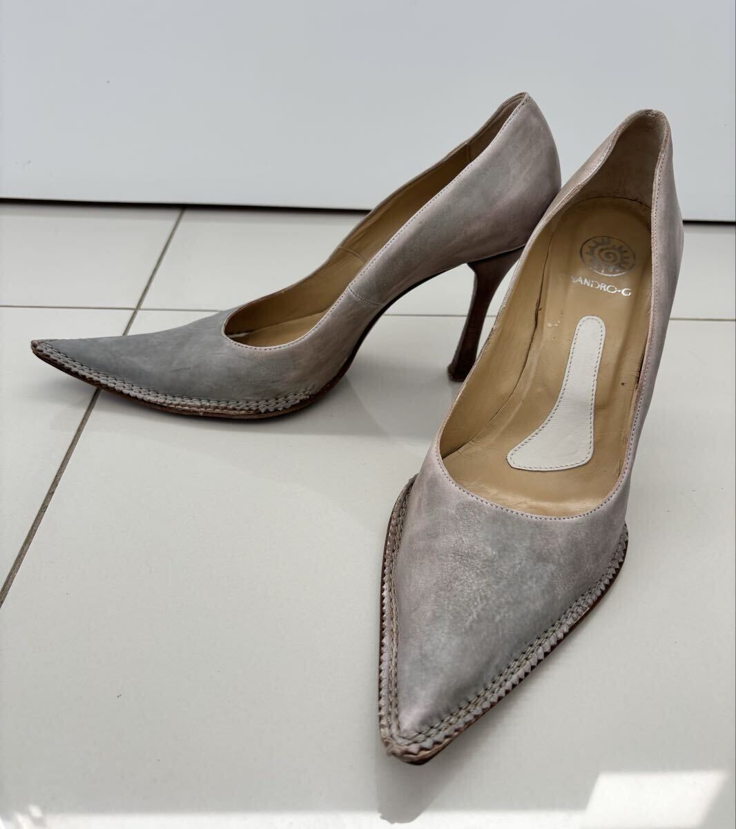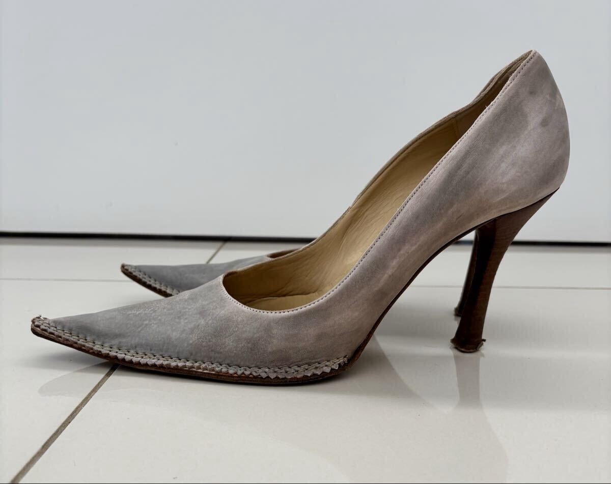 イタリア製のハイヒールです。珍しいグレーカラーです。ハケで塗ったような色合いでアーティスティックな一足です。ポインテッドトゥとサイドのステッチがかなりオシャレな一足です。