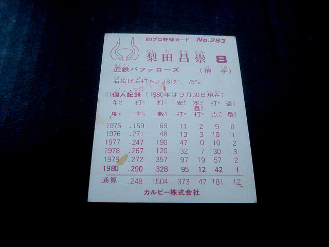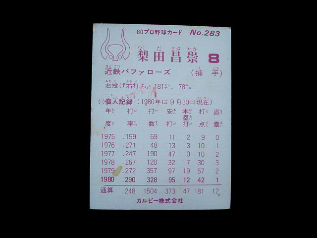 カルビー 1980年 283番 梨田昌崇 近鉄バファローズ 最終ブロック プロ野球カード ハイナンバー