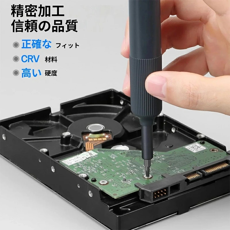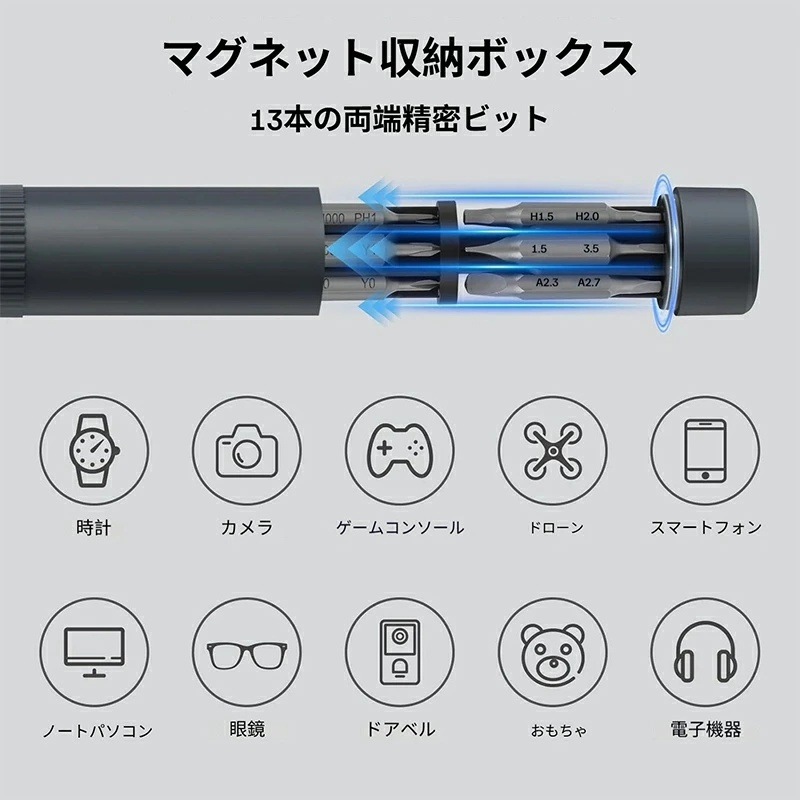 商品番号: YY1025 【27in1多機能ビットセット】 1本のドライバーハンドルと13種類の両頭ビットで構成された実用的なツールセット。ノートパソコン、スマートフォン、Blythe、眼鏡、おもちゃ、時計、ゲーム機など、幅広い機器の精密ネジに対応します。 【マグネット内蔵収納デザイン】 ビットホルダーに内蔵された強力マグネットがビットの紛失を防止。スムーズに出し入れできる構造で、必要なビットをドライバー先端に差し込むだけで磁力でしっかり固定します。 【快適なグリップ構造】 滑り止め加工を施したグリップは手にフィットしやすい多面形状。尾部には静音ベアリングを搭載し、360度スムーズに回転するため、作業がより快適です。 【品質素材と耐久設計】 クロムバナジウム鋼(CRV)製ビットを採用し、熱処理により硬度約52HRCを実現。優れた耐久性と耐摩耗性を兼ね備え、精密作業や長時間使用にも最適です。 素材 クロムバナジウム鋼、ABS 商品内容 13本(両端型)ビット 1本磁気ドリルビットホルダー ※注意事項 ご覧いただく端末やモニター環境により、実際の商品と色味が異なる場合がございます。