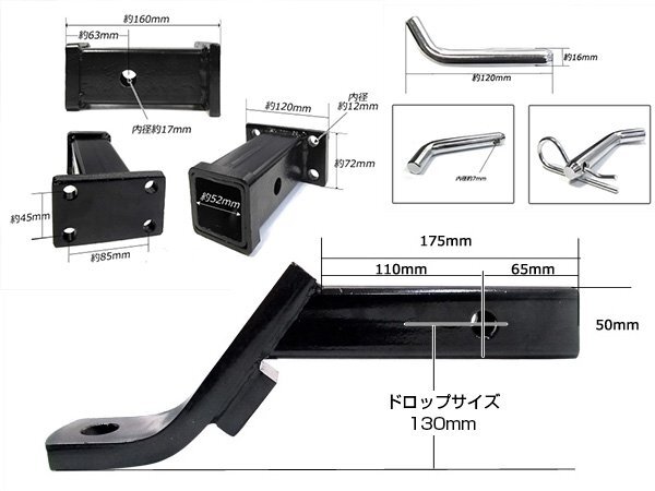 汎用 4穴 ヒッチメンバー 50mm角 50角 4インチ ブラック 黒 フルセット レシーバー&ボールマウント&ヒッチボール&ヒッチピン・クリップ