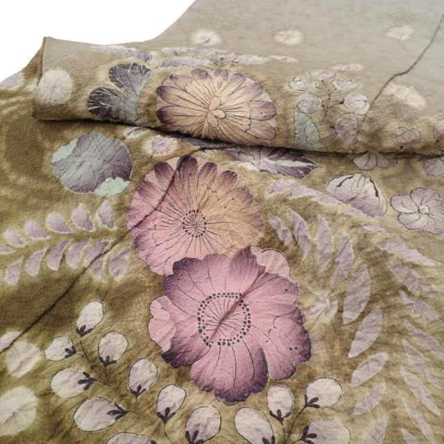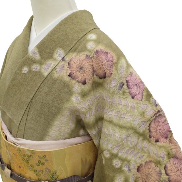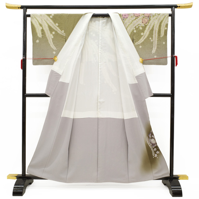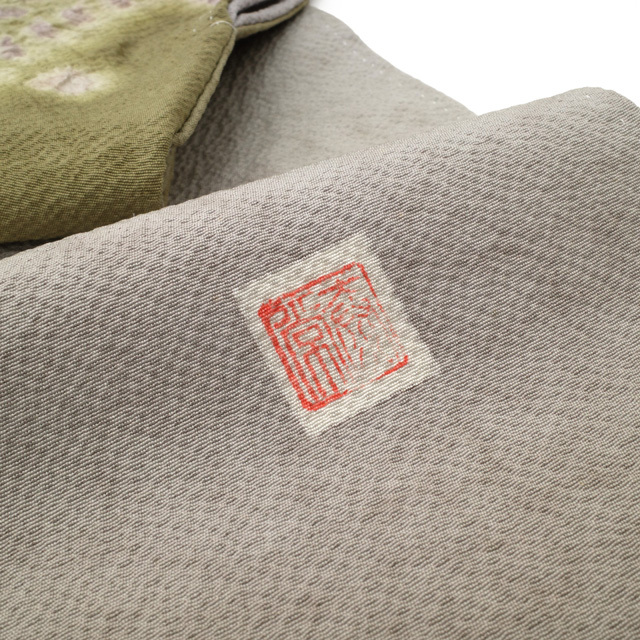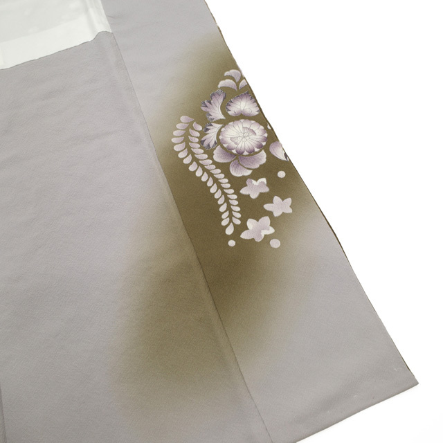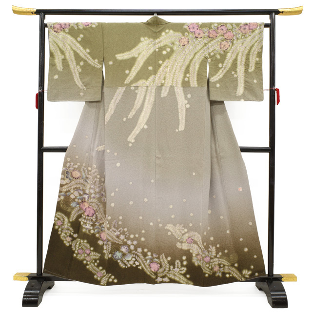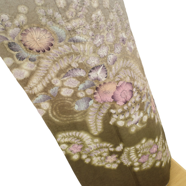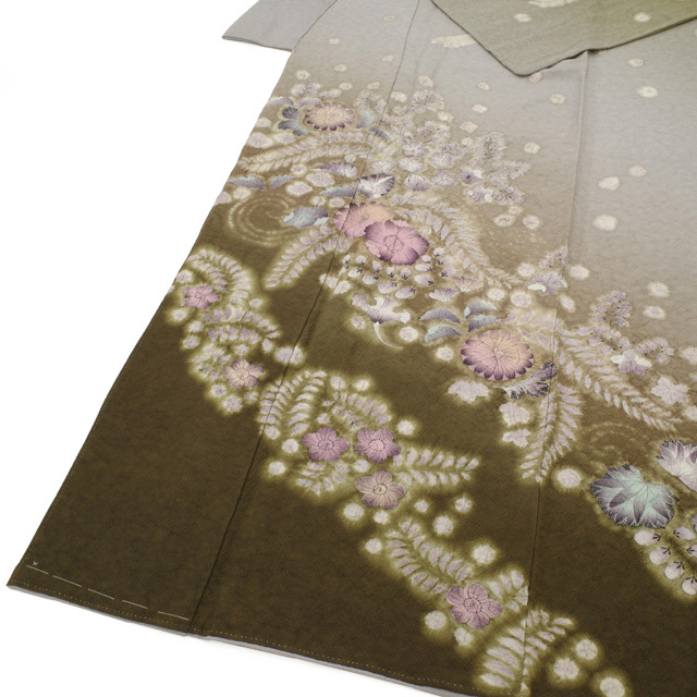 こちらのお着物は、肩から袖にかけての抹茶色が上品に映え、中間にはやさしいライトグレー、そして裾に向かうにつれ、ほんのりと緑を含んだこげ茶へと移ろう、なんとも風情のある染め分けが魅力です。