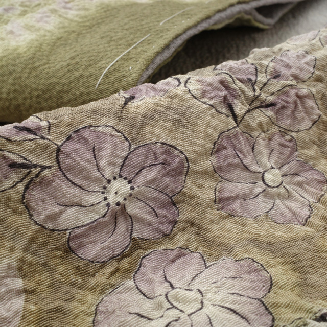 幻想的な辻が花の文様は、絞りの技法を駆使してひとつひとつ丁寧に染め上げられ、おぼろ染めのような独特の濃淡が、まるで霞の中に花が浮かぶような奥行きを感じさせます。