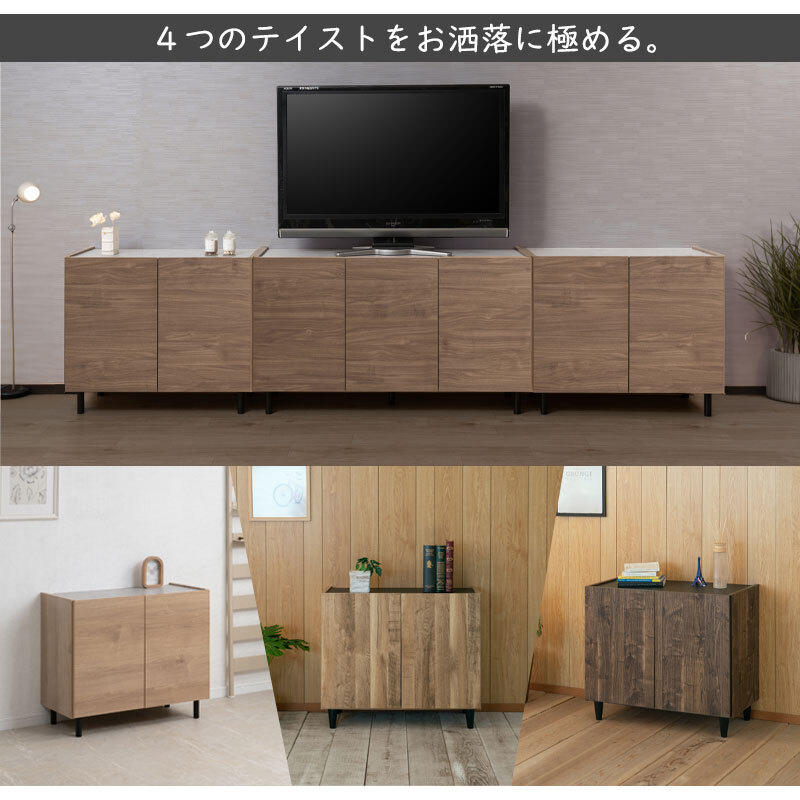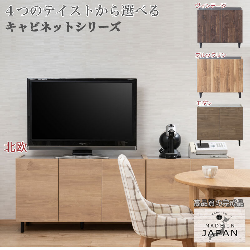 ブルックリン・西海岸ヴィンテージ・北欧・モダン 4つのテイストから選べるキャビネットシリーズ。扉内は、収納物に合わせて高さを変えることができる可動式棚板が幅80cmには2枚、幅118cmには大小各2枚付いています。書類や趣味の物はもちろん、ルーターやデッキを収納しても配線ができるようにコード穴と可動棚後部に約1cmの隙間を設けているので便利。脚は取付式で外しての使用も可能。シンプルな扉だけの収納ラックは美観的にも高見えし、直線的デザインが置きやすい。色違いを並べて使うなど上級者コーデもおしゃれ。