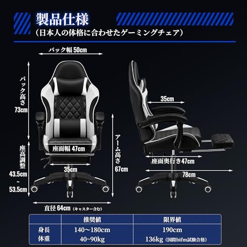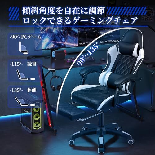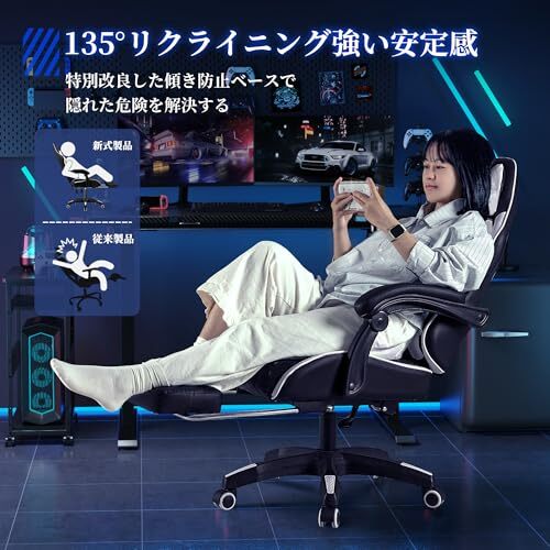 「135°リクライニング強い安定感」最大135°調節、チェア本体の安定性を高めると同時にリラックス効果を最大限に活かす。連動式アームレストと格納式オットマンに合わせて、全身を一所も逃さず支えて、最高なリラックスを提供する。格納式オットマンは使わない時は座面下に収納可能、省スペースで利便である。ざまざまな工夫で、作業とゲームプレイの姿勢や動きの変化、体格に応じて最適なサポートを実現している。オフィスでの休憩や仮眠にもおすすめのゲーミングチェアです。
