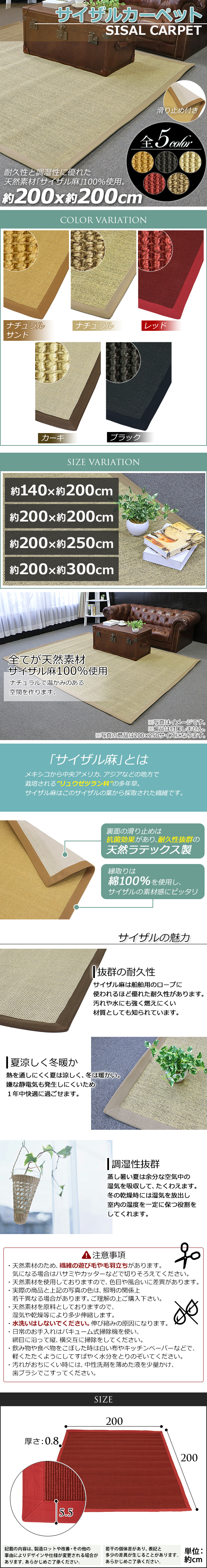 | 商品名 | 送料無料 サイザル カーペット 5カラー選択 200×200cm 約2畳 2畳 ラグ 絨毯 敷物 マット じゅうたん 麻 100%天然素材 自然素材 滑り止め付き 正方形 オールシーズン おしゃれ シンプル 無地 センターラグ リビング ダイニング フローリング 居間 sisalred200200 |