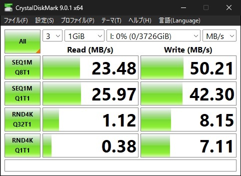読み込み:約23MB/s、書き込み:約50MB/s(画像の通り)