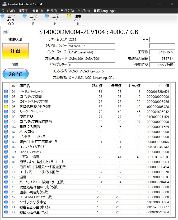 ・ CrystalDiskInfoでは「注意」表示となっています(詳細は画像参照)