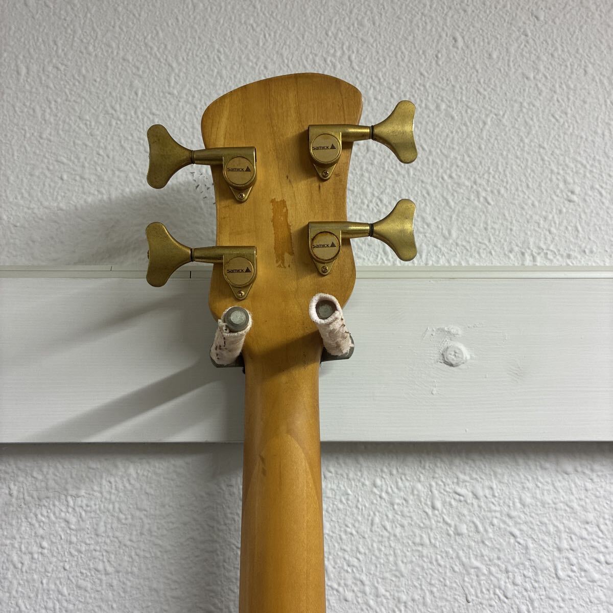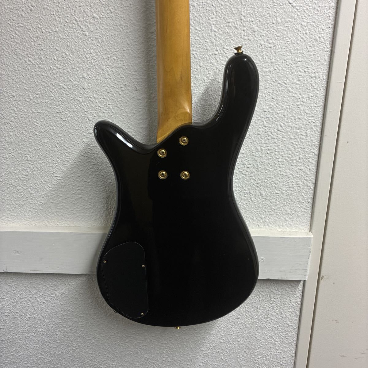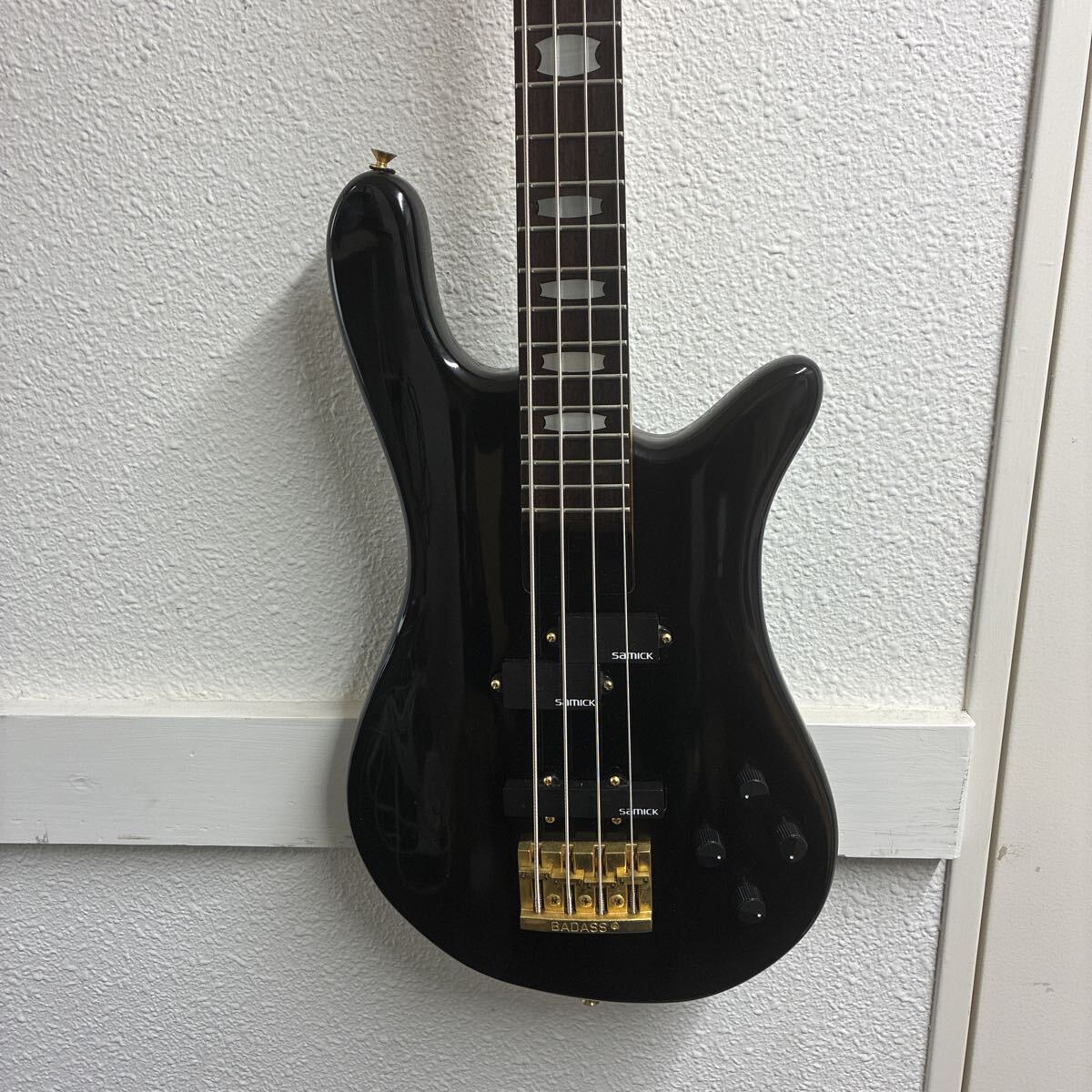 こちらは韓国のギターメーカー、Samick (サミック) 製の4弦エレキベースです。世界的にも人気の高いベースブランド Warwick (ワーウィック) の代表的なモデル Corvette (コルベット) に酷似した特徴的なボディシェイプを持っています。