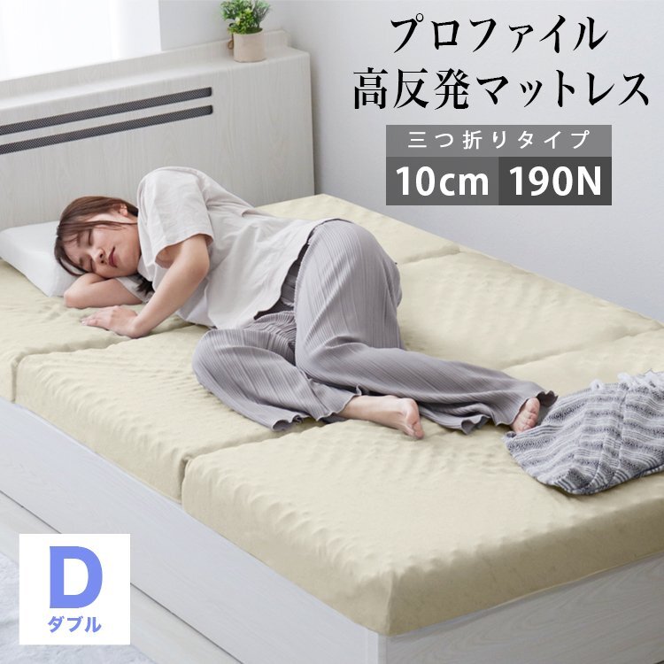 \体圧が分散されるプロファイルタイプ/ 凹凸した表面が、身体の形状に沿って変形するので、包まれるようなフィット感が生まれます。 負荷がかかりやすい腰回りなども持ち上げるように支え、身体の広い範囲へ圧力を分散します。 沈みこまない反発力で寝返りをサポート! 厚みたっぷり10cmで、1枚でも底付き感のない寝心地。 高反発マットレスは下からの跳ね返りの力により、沈み込みが少ないのが特徴です。 その為、寝返りがうちやすく就寝時の身体の一部分(首・肩・腰・足)にかかる体圧も分散。 寝返りが多い方や仰向けに寝ることが多い方にオススメです。 三つ折りタイプは、押入れなどに収納しやすく、立て掛けておいても場所をとりません。 カバーは取り外して洗濯することができます。 【商品仕様】 ・カラー:ベージュ ・サイズ:(約)幅140×奥行き195×厚さ10cm(ダブルサイズ) ・重量:(約)8.3kg ・硬さ:190ニュートン ・素材: マットレス本体:高反発ウレタン カバー:ポリエステル100% 【注意事項】 ・圧縮梱包されたままの状態で長期間保管した場合、マットレスが復元できなくなってしまいます。商品到着後、1週間以内に必ず圧縮から開放をして頂くようにお願いいたします。 ・マットレスは約1-2日で復元します。気温や温度により3-14日かかる場合もあります。 ・製品の臭いが気になりましたら、風通しの良いところで脱臭してください。この臭いは素材のウレタンによるもので無害です。臭いに敏感な方は十分ご検討の上、ご購入をお願いいたします。 ・【プロファイルタイプ】のマットレスは、ホワイトウレタンの特性により黄変する場合がございます。 ・マットの硬さは温度によって変わってきます。また、硬さの感じ方には個人差があります。 ・カバーは取り外して洗濯ができますが、マットレス本体は洗濯しないでください。 ・仕様・デザインは改良のため予告なく変更することがあります。 |
