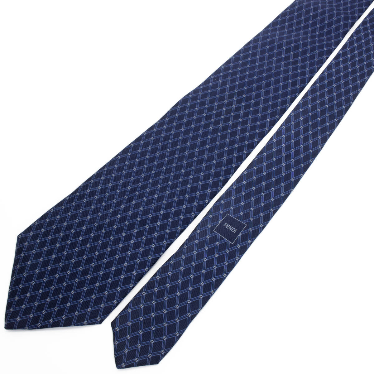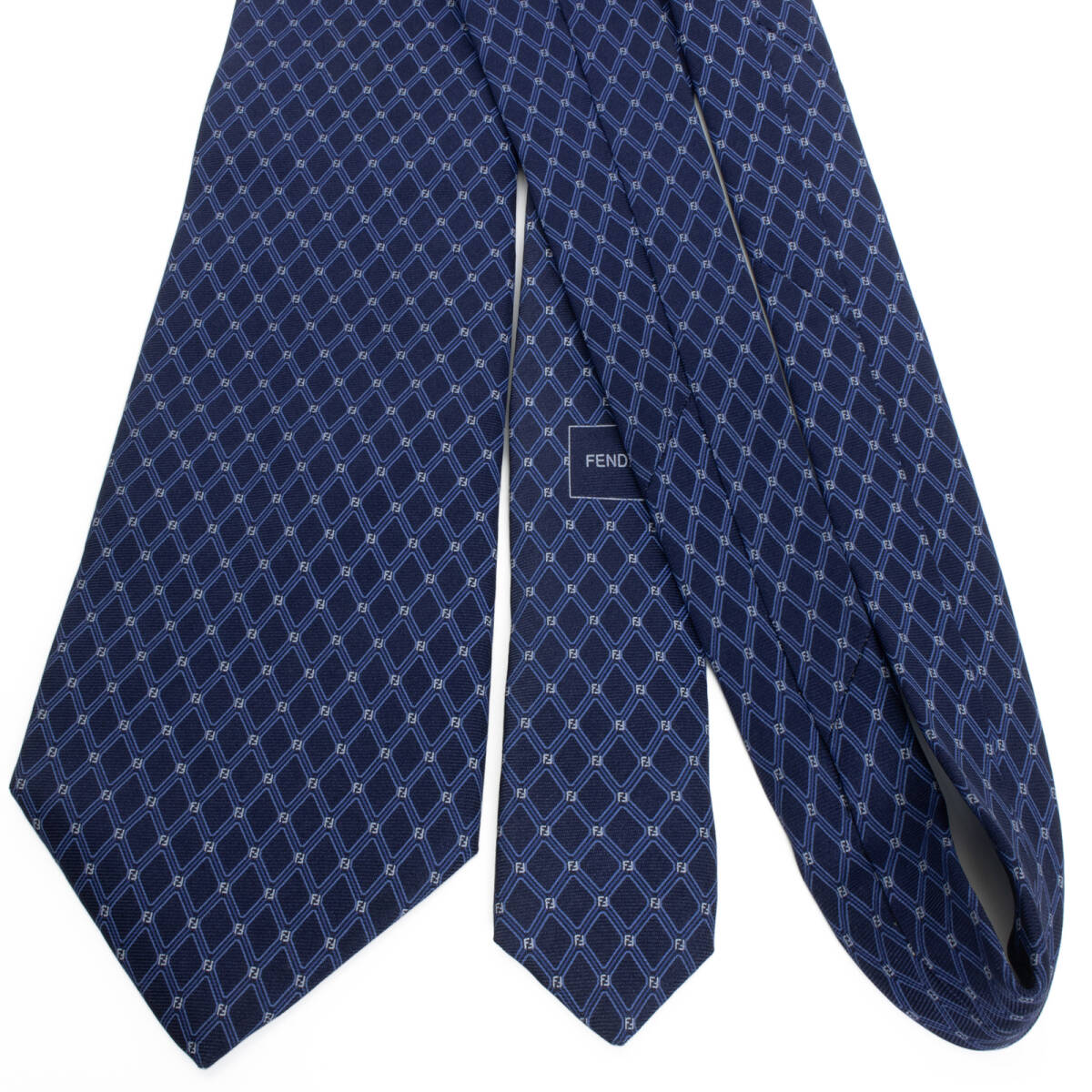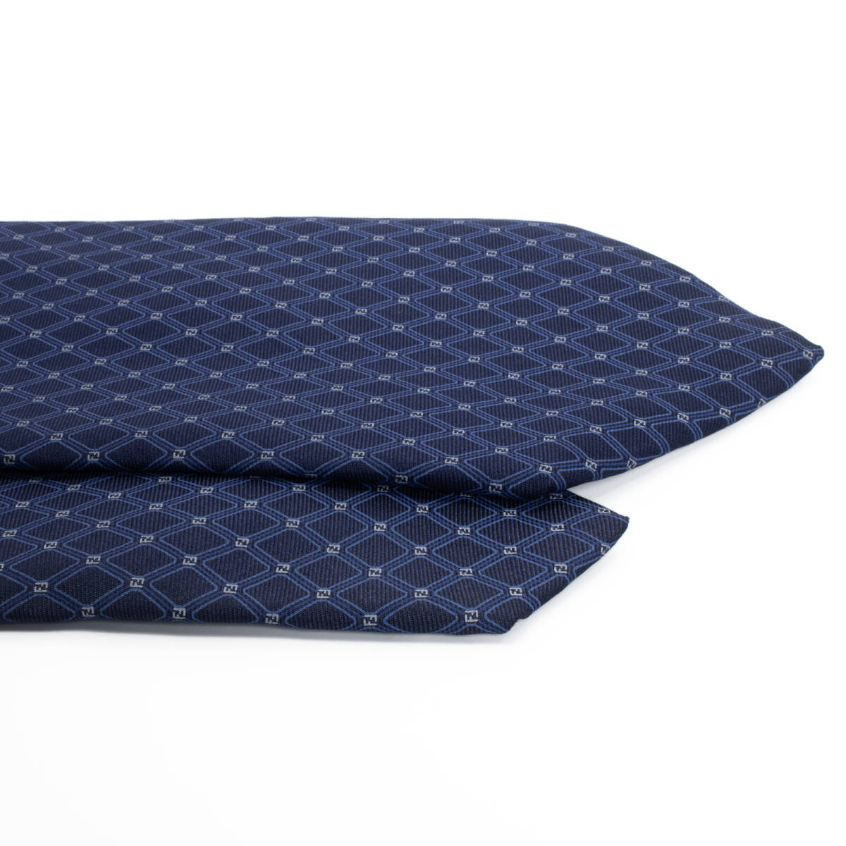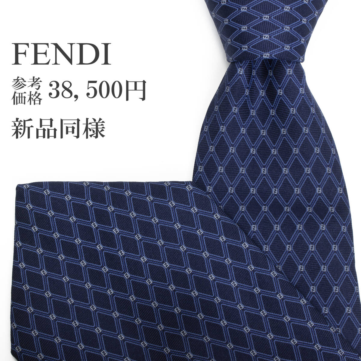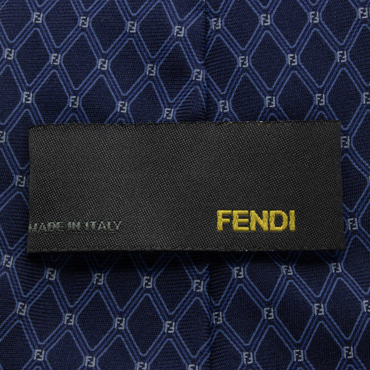 送料無料 フェンディ ネクタイ レギュラータイ 新品同様 シルク ネイビーブルー 青 グレー 総柄 FF柄 ロゴ マーク ひし形 珍しい 綺麗 S514