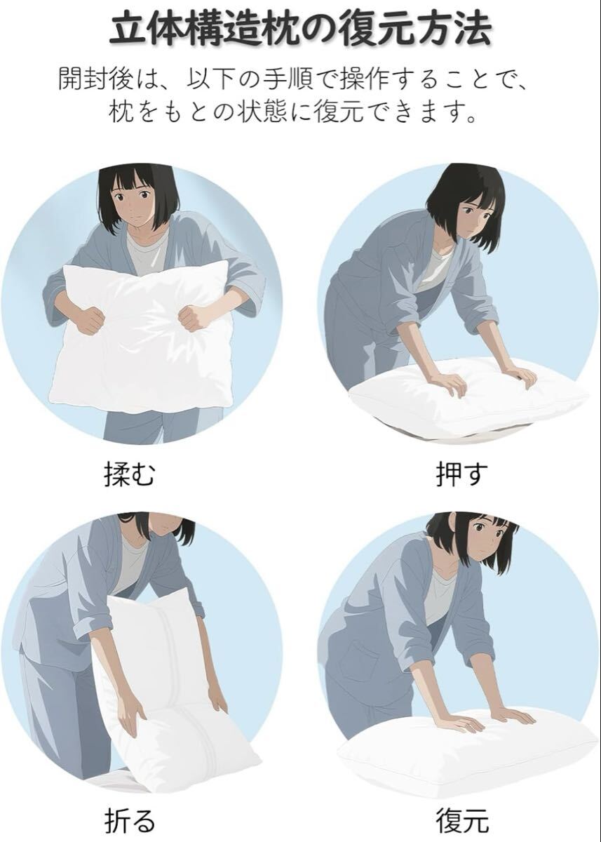 ファスナーで中綿の量を調節できるのに加え、「揉む・押す・折る・整える」の4つの簡単な操作で、自分にぴったりの高さとフィット感にカスタマイズ可能。日常の洗濯後も同様の方法で枕のふんわり感を回復できます。低めの柔らかさが好みの方も、高めのしっかり感が好みの方も、理想的な寝姿勢を実現できます。