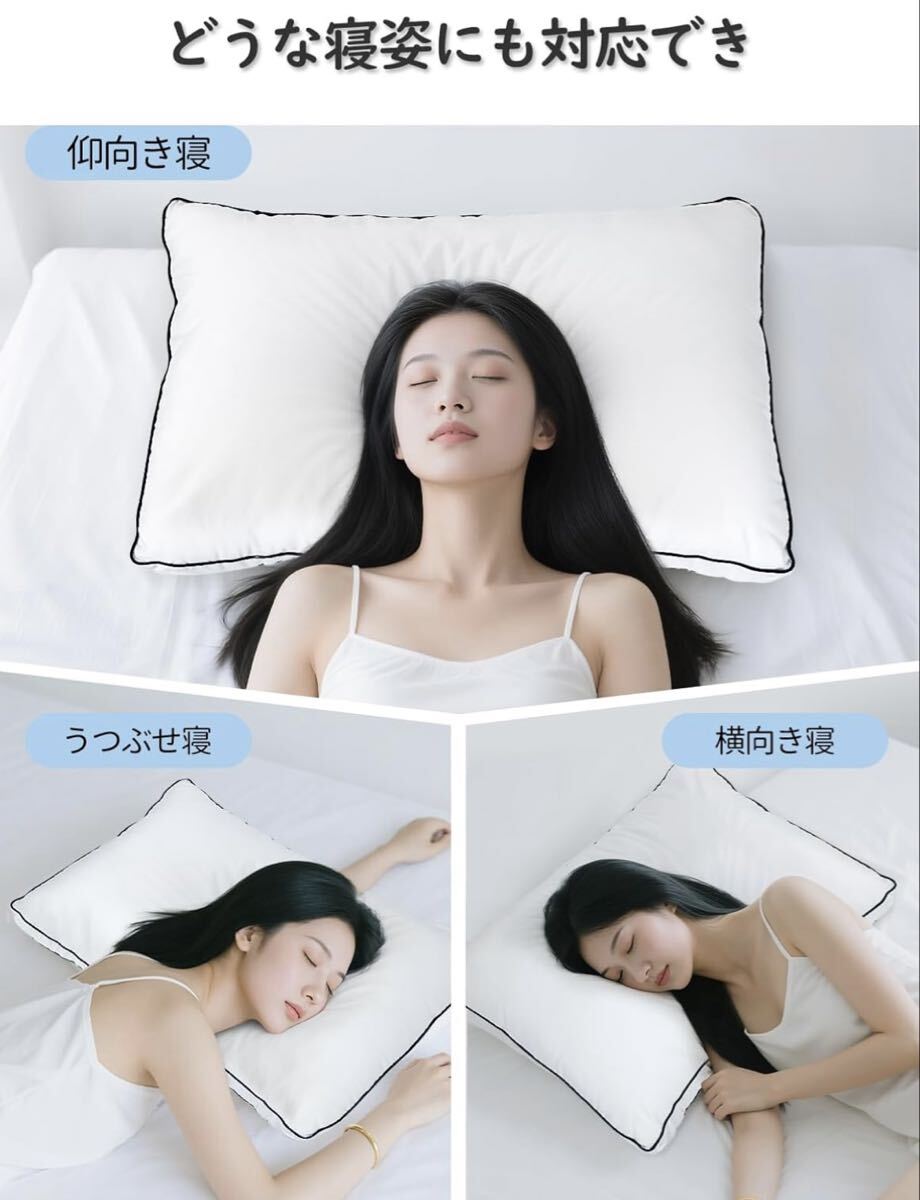 側面には型崩れを防ぐマチ加工を施し、ふんわりとした柔らかさと適度な弾力を両立した立体構造を実現。首や肩への負担を軽減しながら、寝返りを打っても快適な姿勢をキープできます。仰向け・横向き・うつ伏せなど、お好みの寝姿勢でぐっすり眠れる枕です。