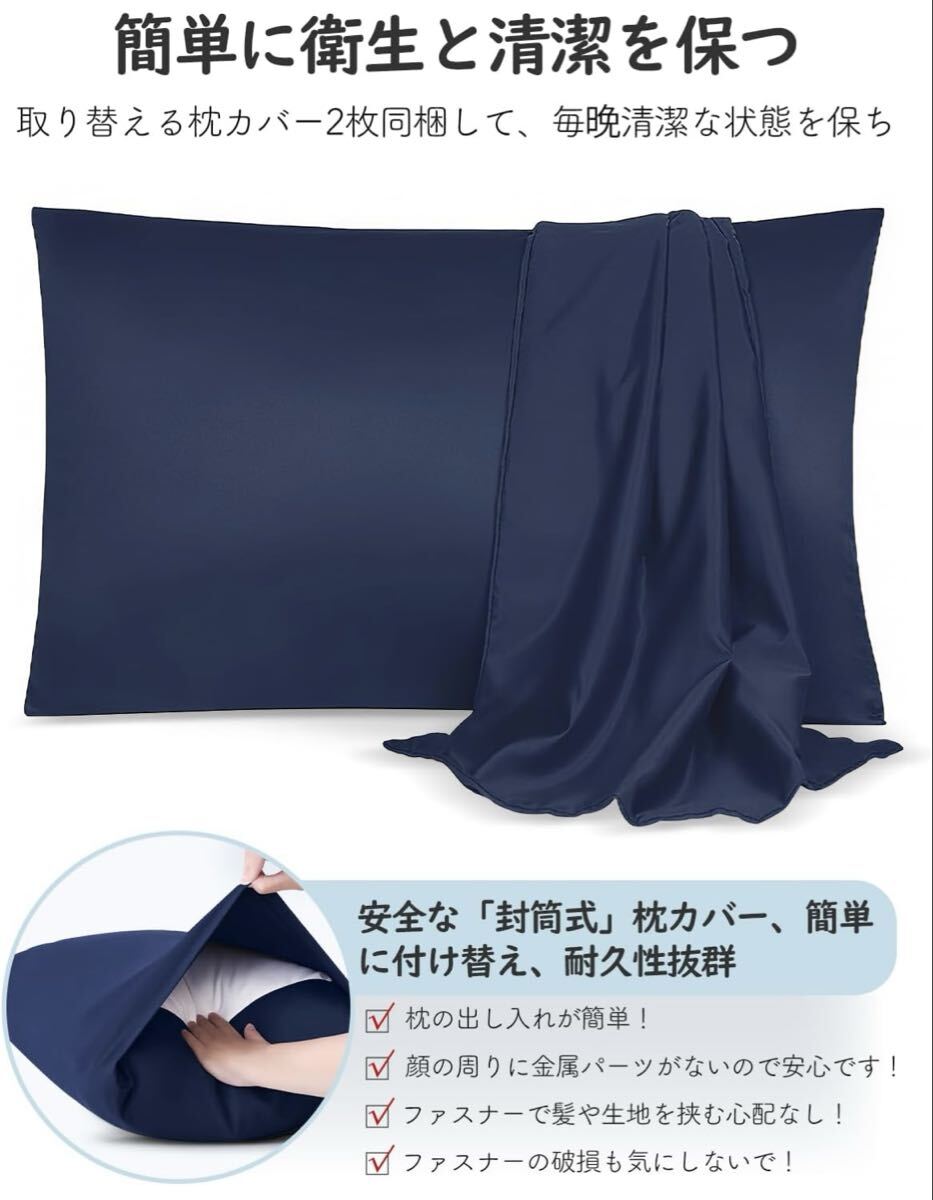 生地には上質なポリエステル100%を採用。なめらかで柔らかな肌ざわりが特徴で、頬に触れた瞬間から心地よさを実感できます。通気性にも優れており、季節を問わず快適に使用可能。毎日の眠りをより上質なひとときへと導く、プレミアムなまくらカバーです。