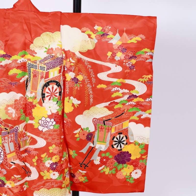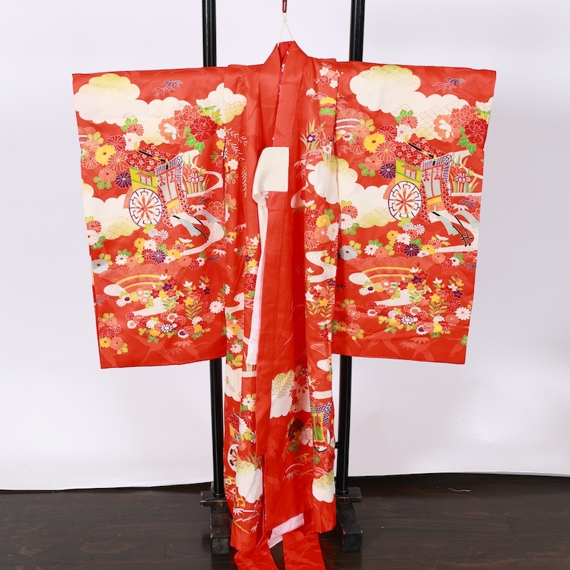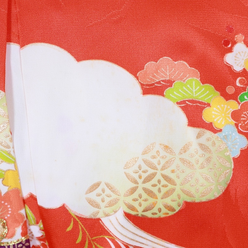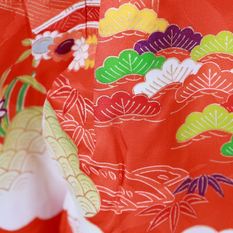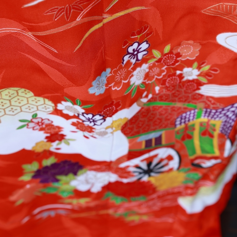 鶴の地紋通しの生地に可愛い赤をベースに古典の柄を染め上げた素敵なお品になります。