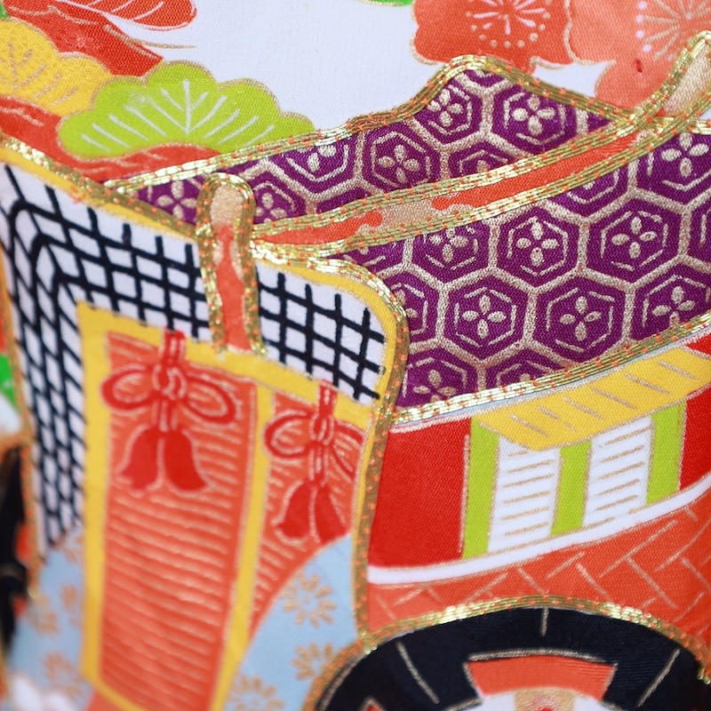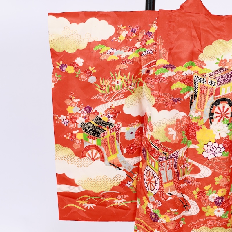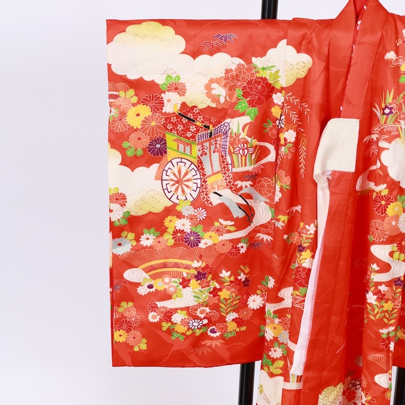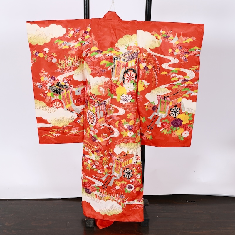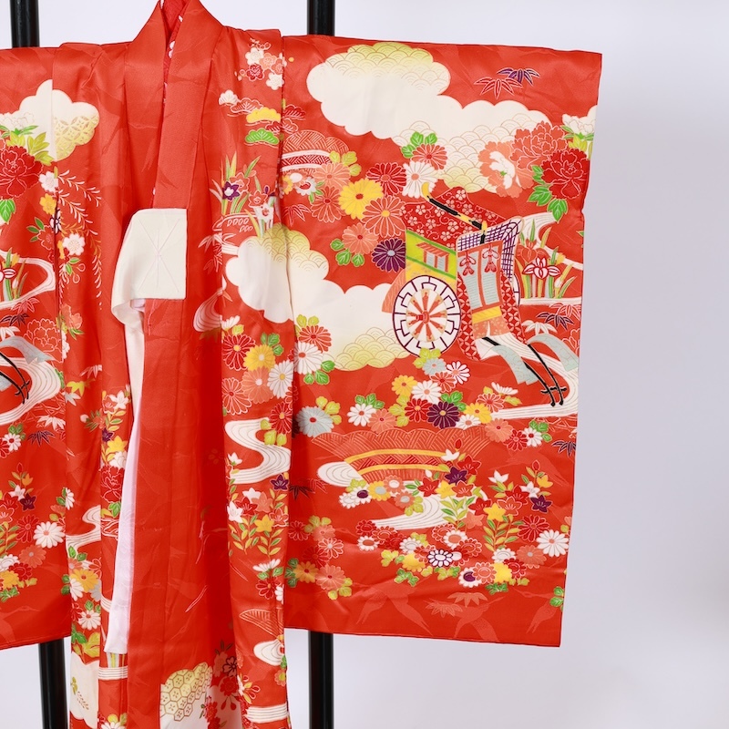 鶴の地紋通しの生地に可愛い赤をベースに古典の柄を染め上げた素敵なお品になります。