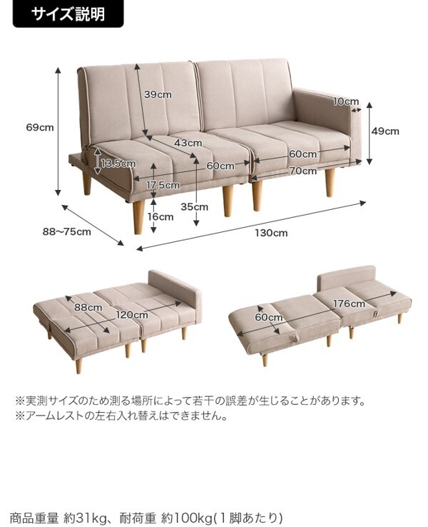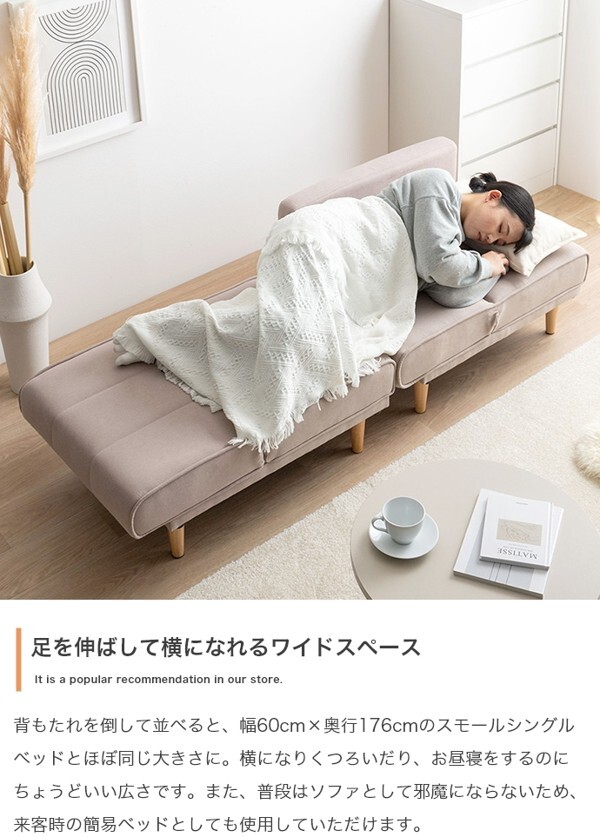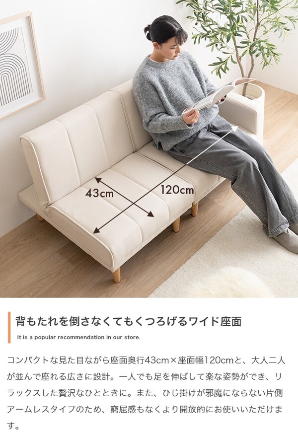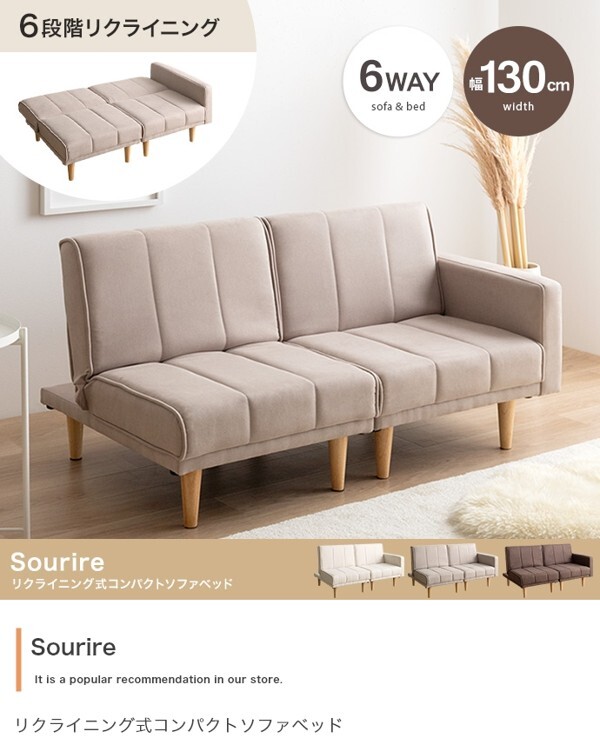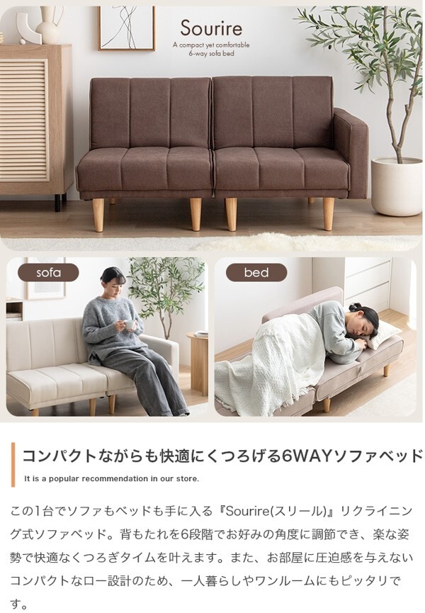 ※現在ご覧の商品ページはアイボリーのご購入ページとなります。 ヤフオクの仕様上単一ページに複数バリエーションを掲載することができませんので、他バリエーションが希望の場合は別ページでご購入お願い致します。 コンパクトながらも快適にくつろげる『Sourire(スリール)』リクライニング式ソファベッド。 この1台でソファもベッドも手に入る、ワンルームにも置きやすいコンパクトソファです。 背もたれを6段階でお好みの角度に調節でき、楽な姿勢で快適なくつろぎタイムを叶えます。 また、コンパクトなロー設計のためお部屋に圧迫感を与えず、一人暮らしやワンルームにもピッタリです。 配達業者を指定いただくことはできません。 沖縄・離島に関しましては、別途配送料が必要となります。 北海道への配送も別途配送料が必要になる場合がございます。 ※別途送料が発生する場合は後ほどご連絡させていただきます。 タイミングによっては在庫切れの場合があります。