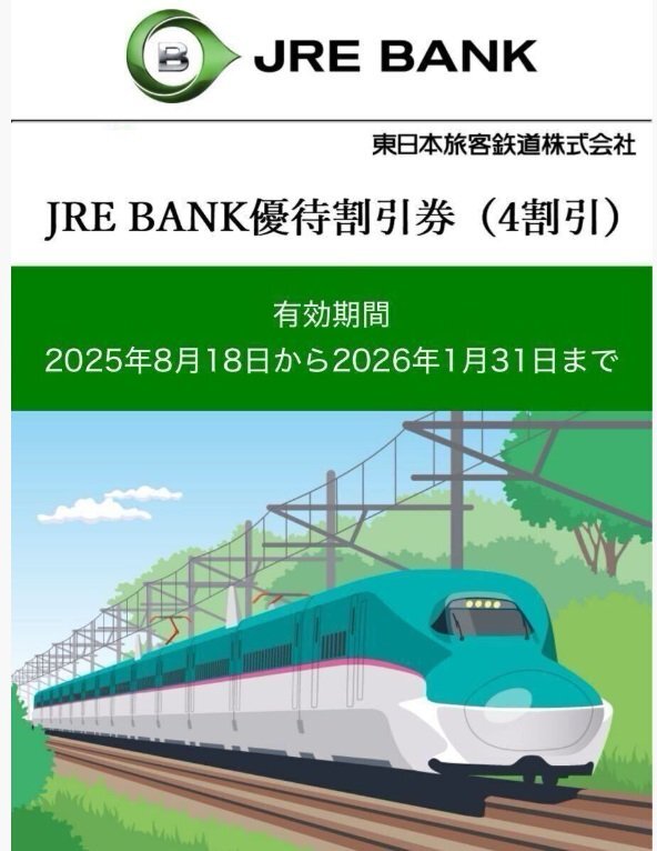 JREBANK4割引優待券 JR東日本 えきねっと WEB申込専用 1枚 2025年8月18日~2026年1月31日まで利用可 インボイス対応領収書発行