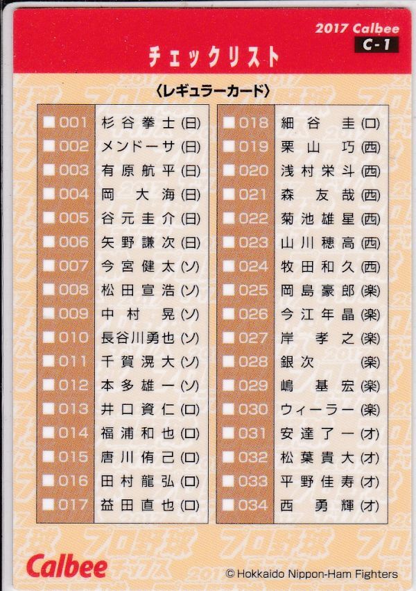 ●2017カルビー/チェックリスト 【3度目の日本一】 日本ハム No.C-1
