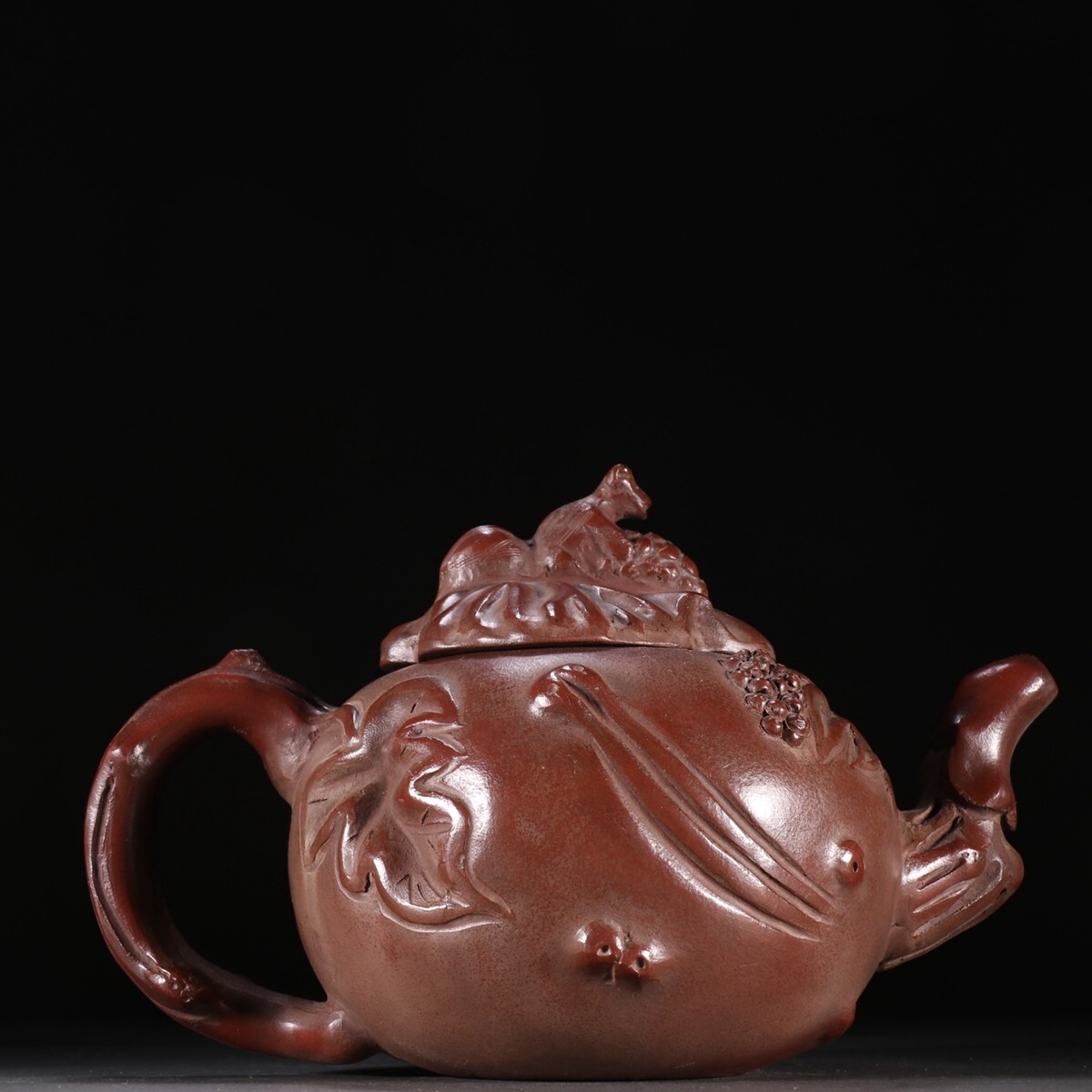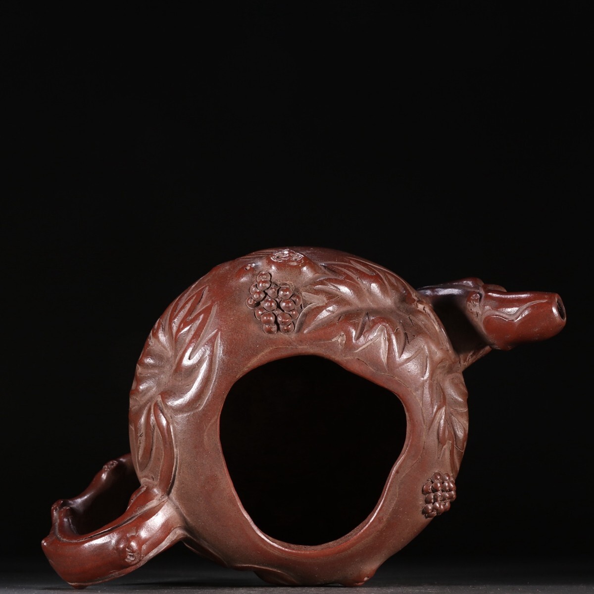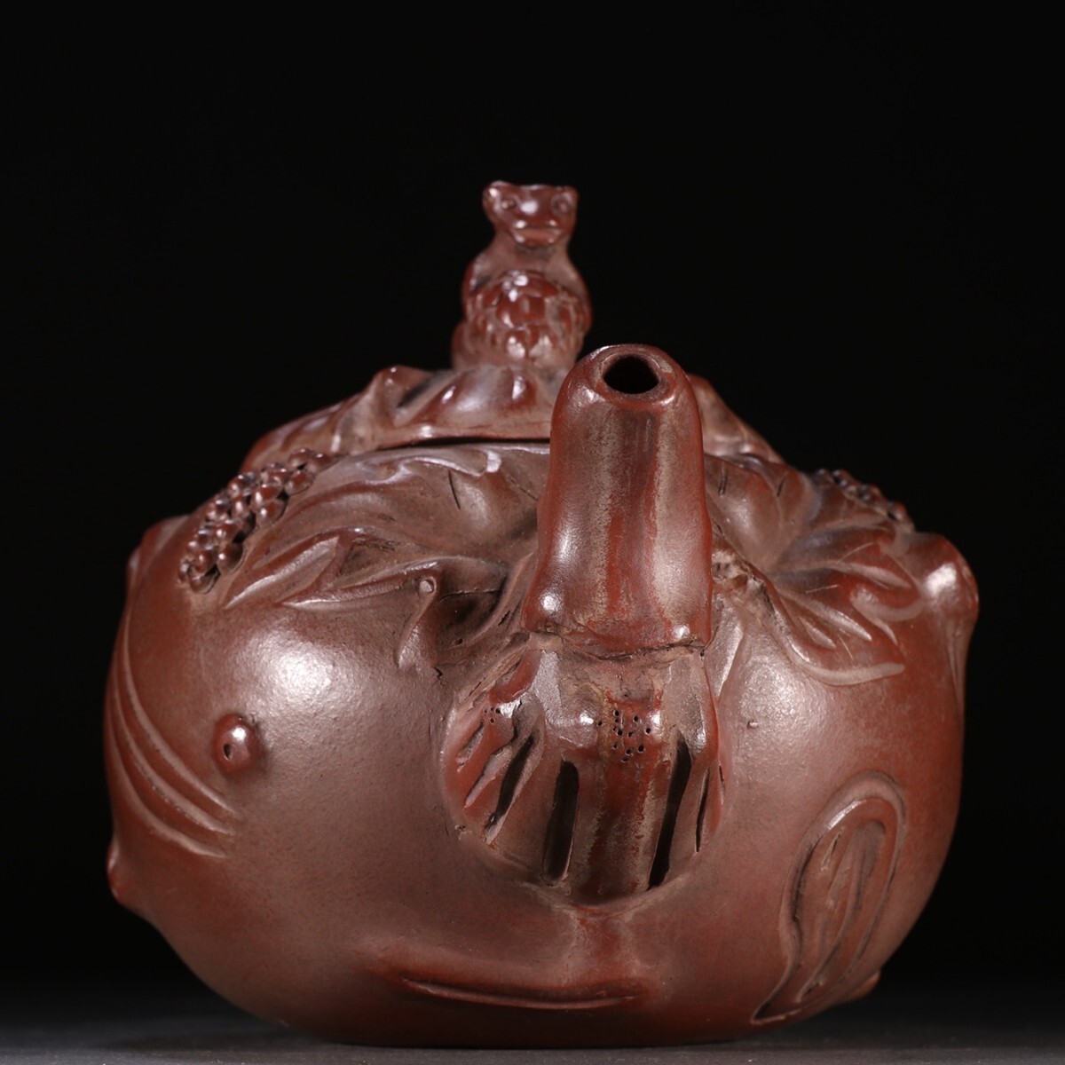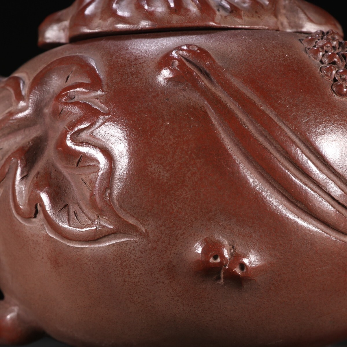 【瓏】紫砂彫 松鼠葡萄茶壺 項真銘 明時代 中国陶磁器 陶芸 後手急須 茶壷 茶道具 置物 古美術 蔵出