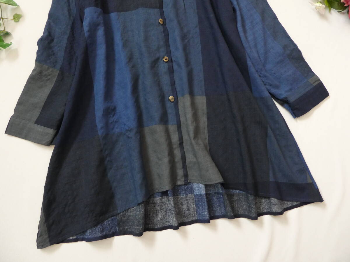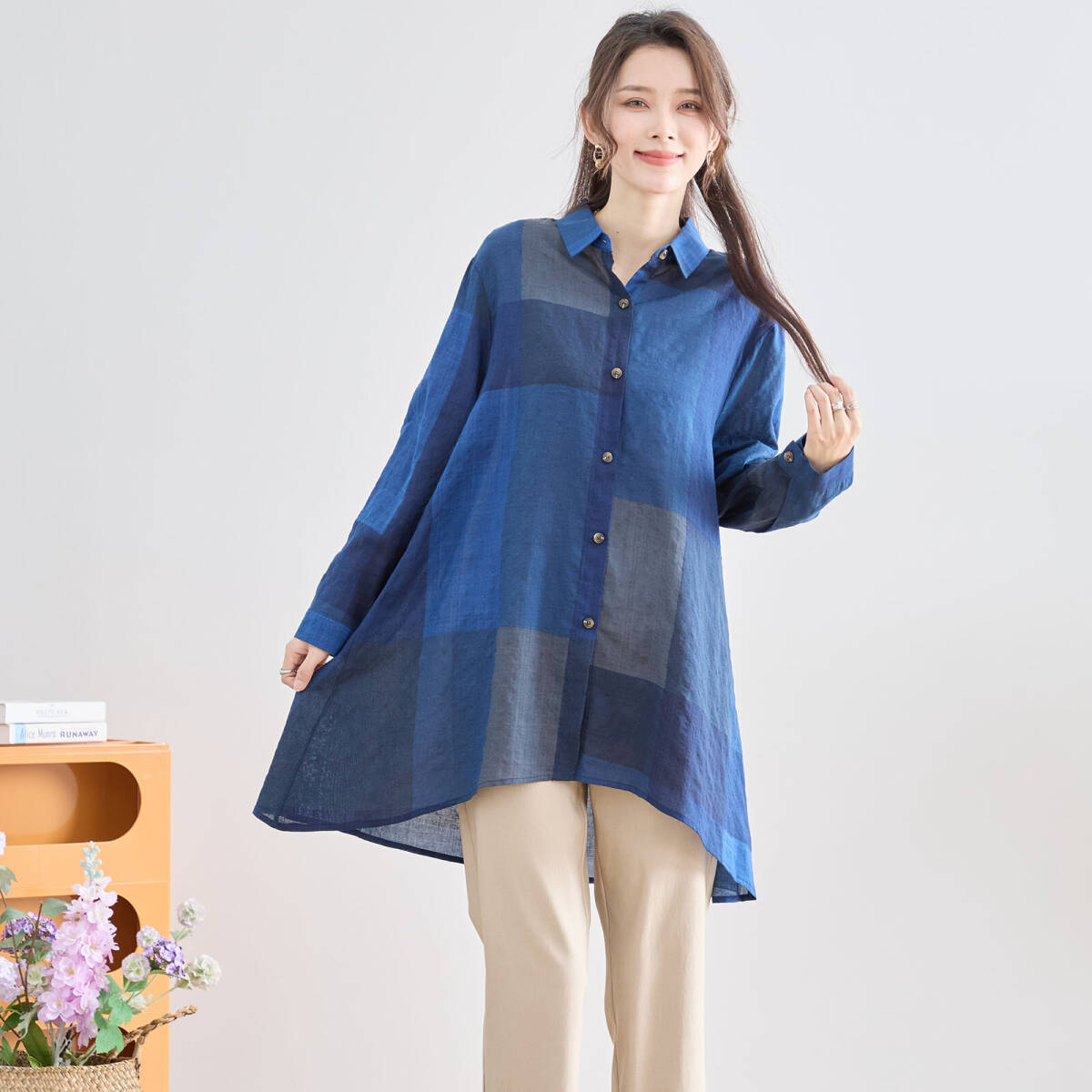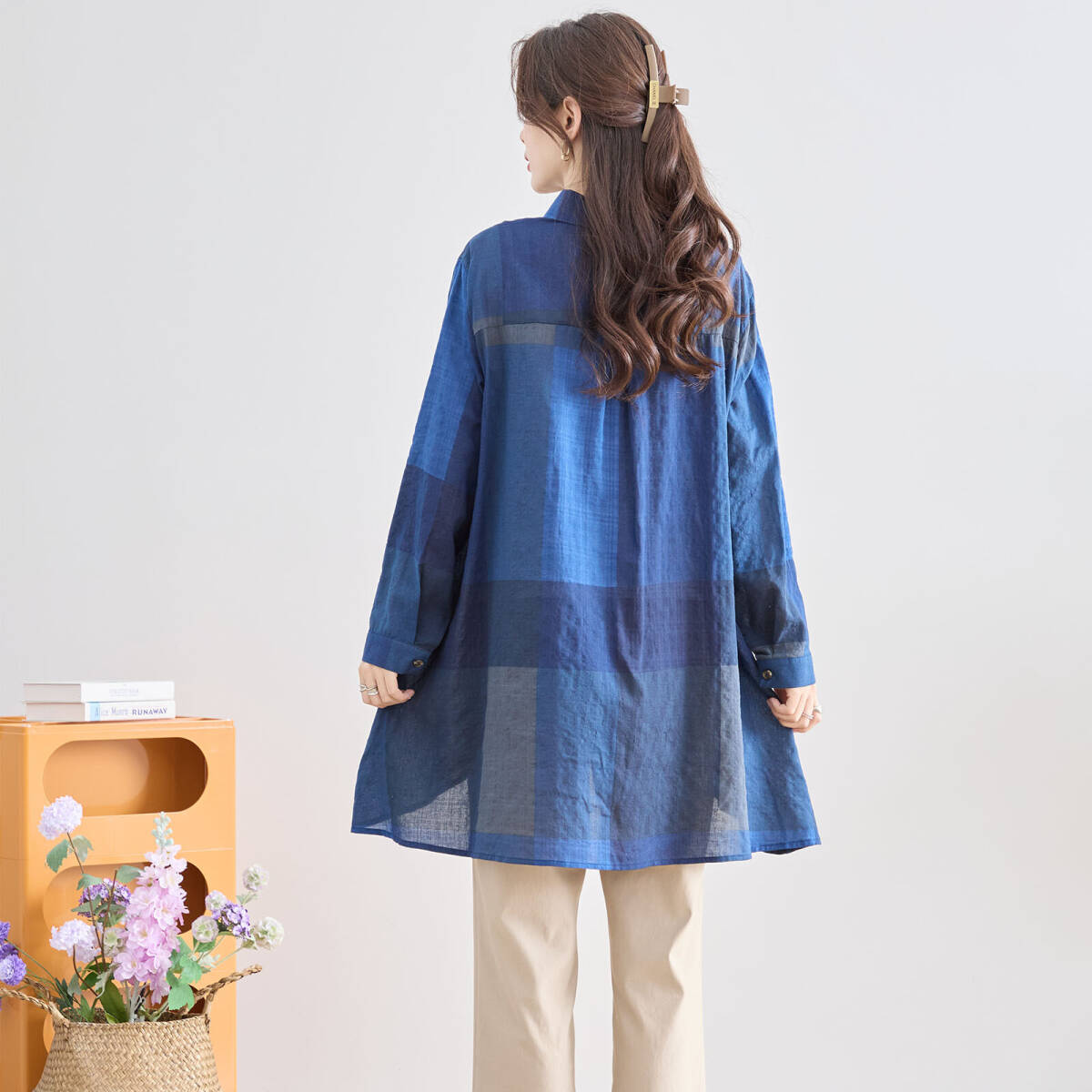 L~LL/3L【新品】ブロックチェック柄プリント・綿100%☆ゆったりロングシルエットシャツ◇羽織り物・ネイビー◆fit1027◆
