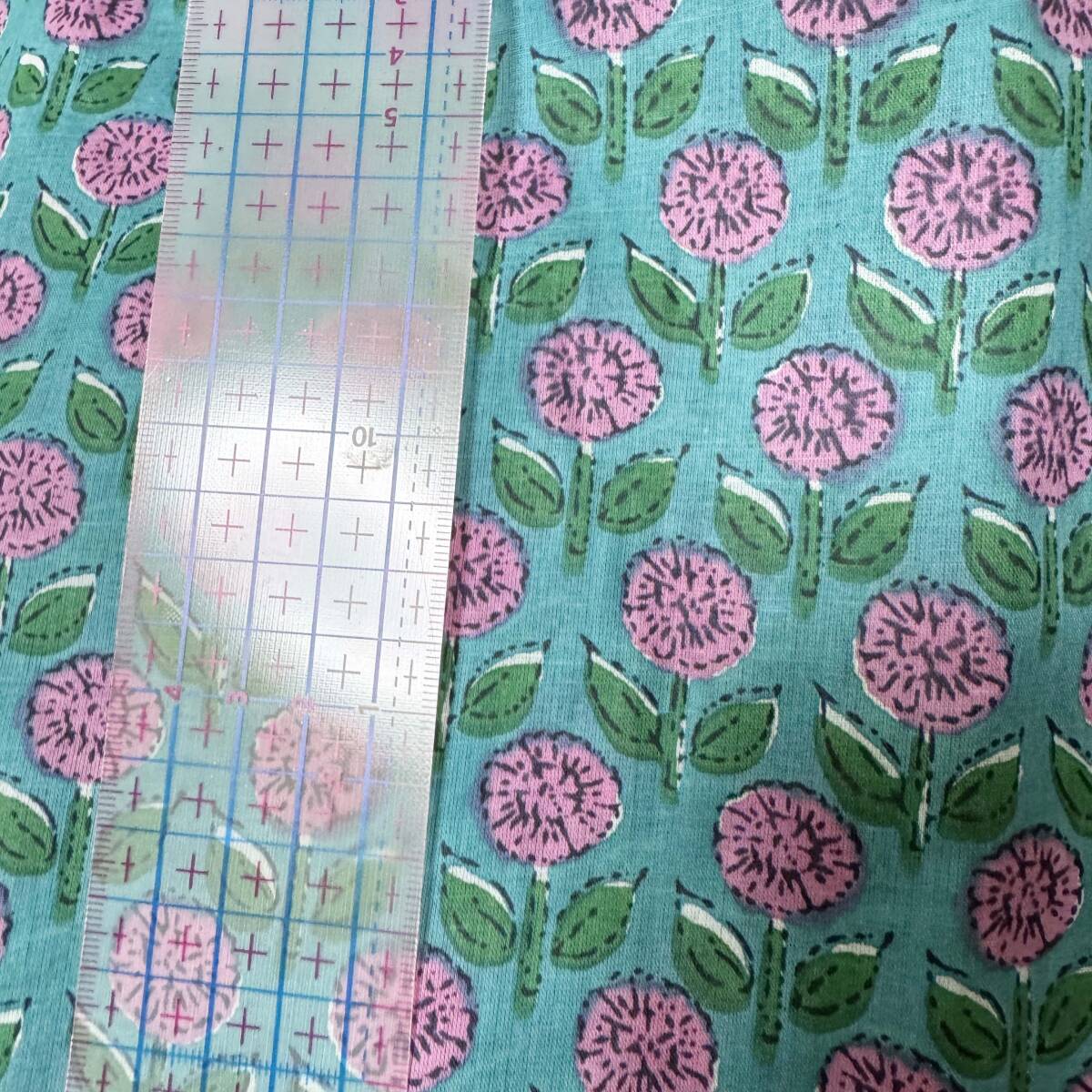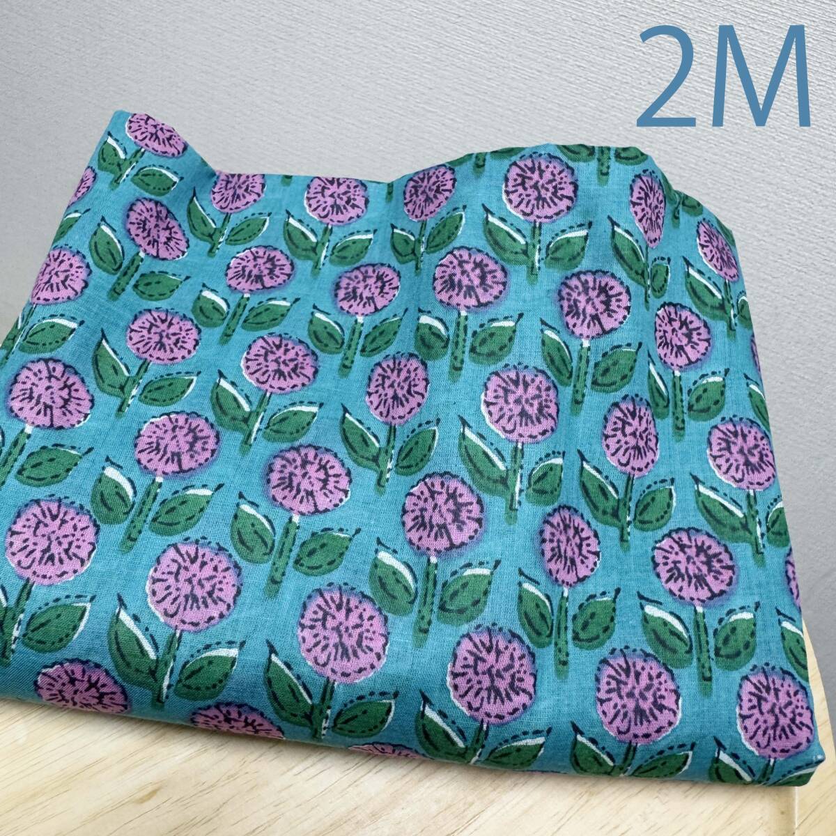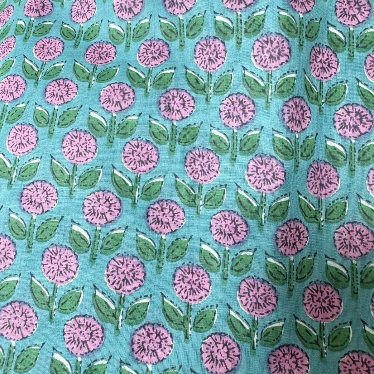 インド綿ボイル★まるい花と葉っぱ柄ターコイズ地×ピンク花柄生地2m布はぎれシアー