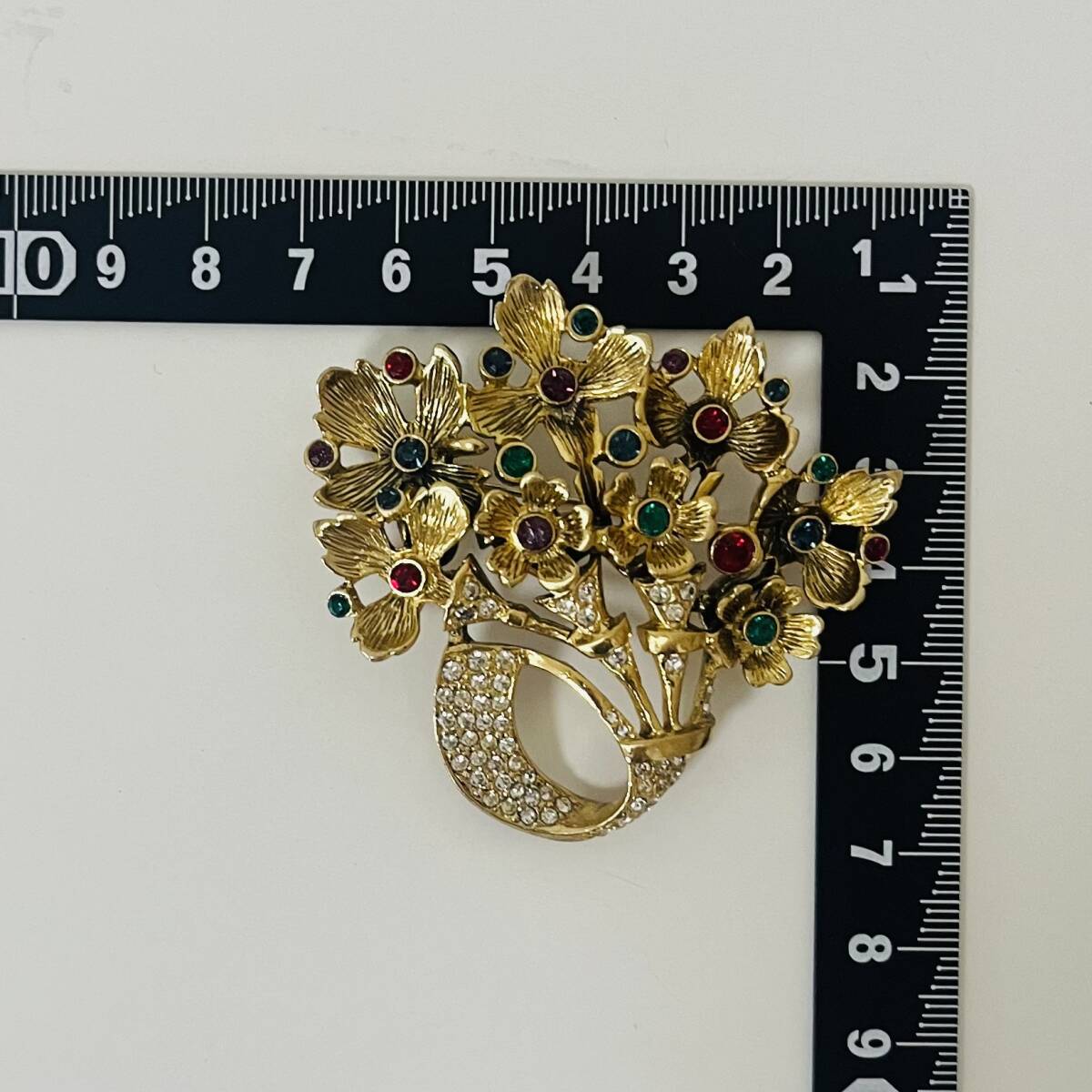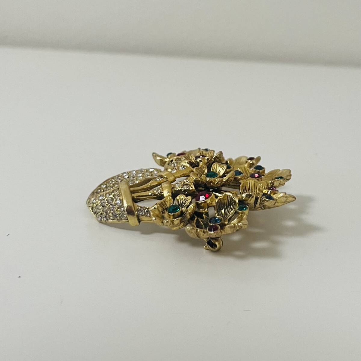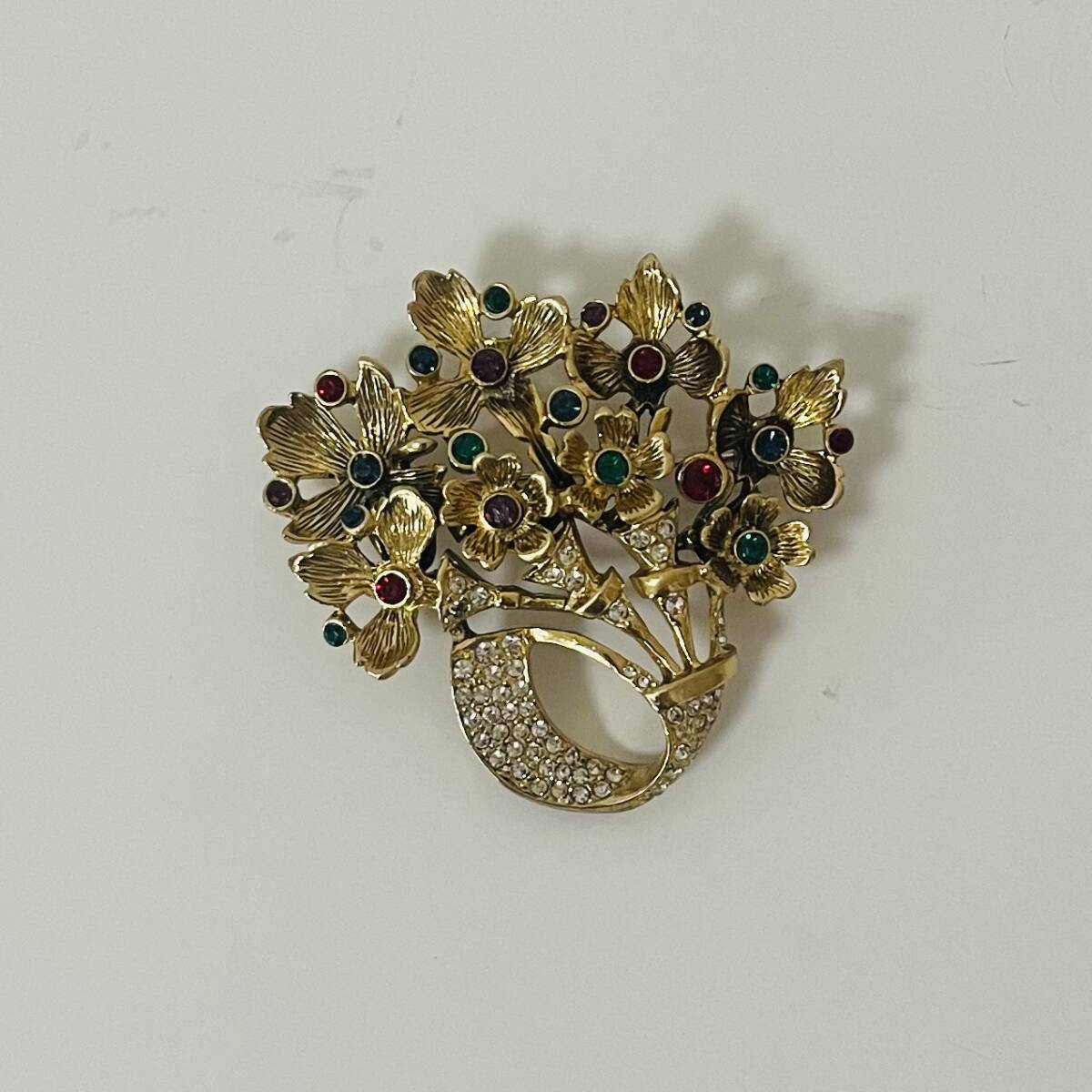 395 アンティーク ビンテージ コスチュームアクセサリー ブローチ 未使用保管品! ゴールドカラー ラインストーン カラーストーン キラキラ 花 カラフル 海外製