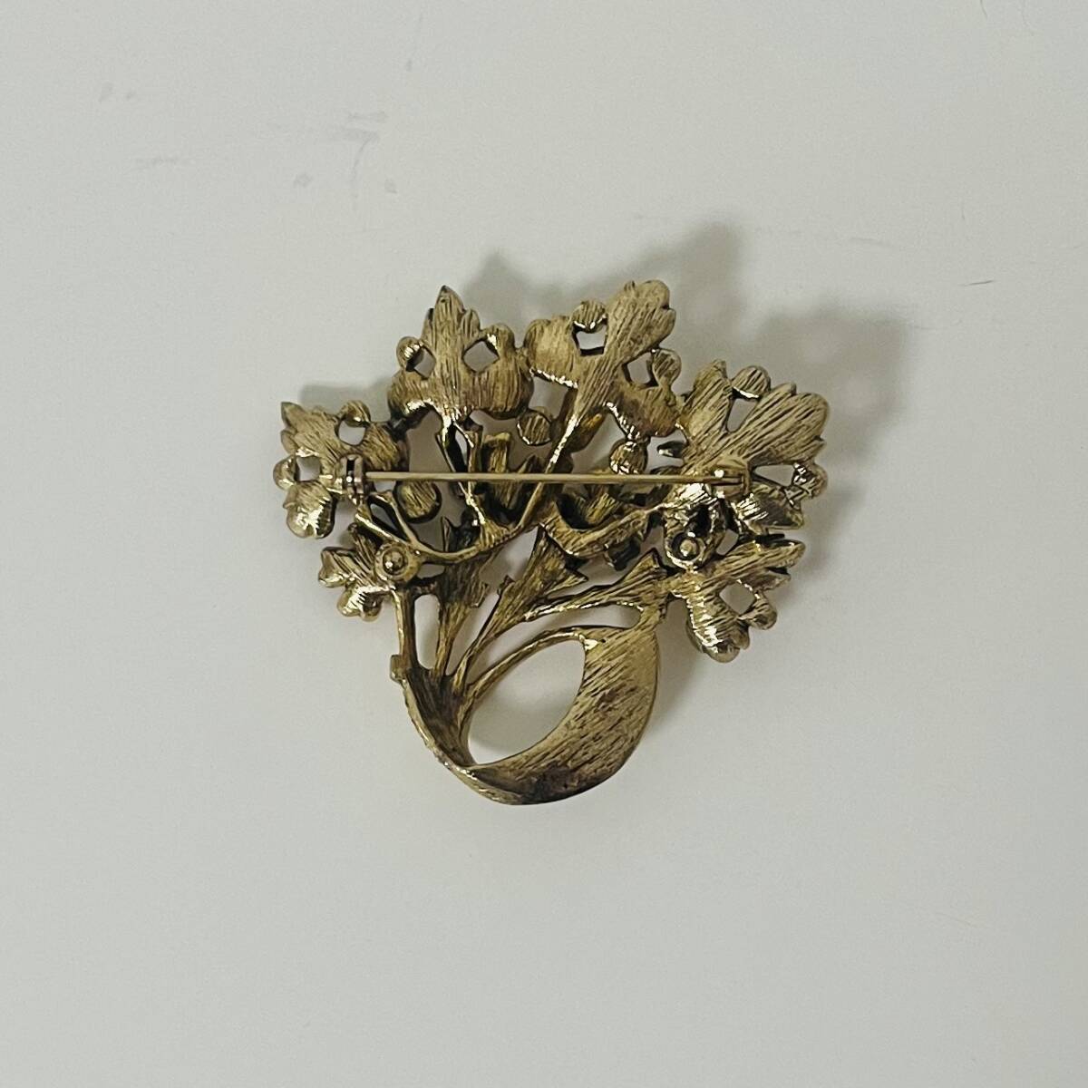 395 アンティーク ビンテージ コスチュームアクセサリー ブローチ 未使用保管品! ゴールドカラー ラインストーン カラーストーン 花 海外製