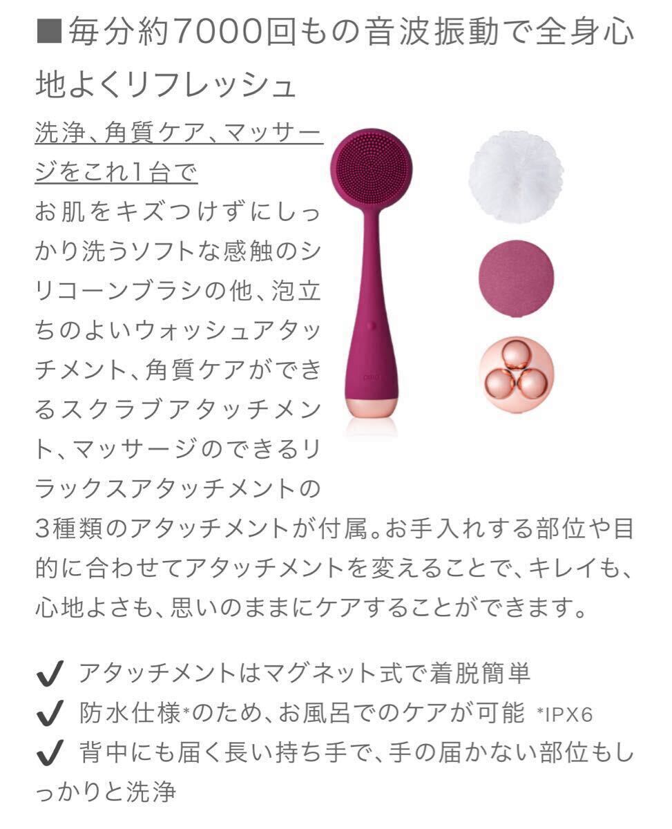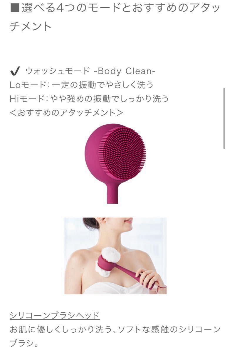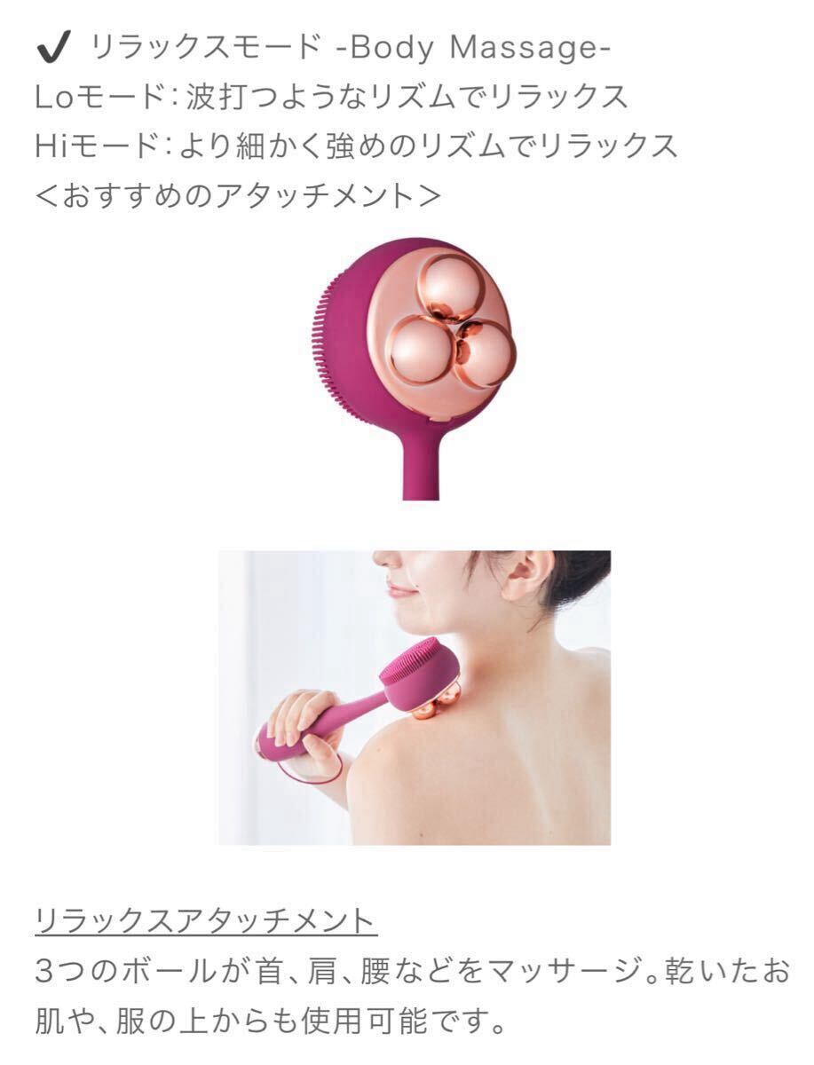・付属品:充電ケーブル1本、ウォッシュアタッチメント1個、スクラブアタッチメント1個、リラックスアタッチメント1個、取扱説明書