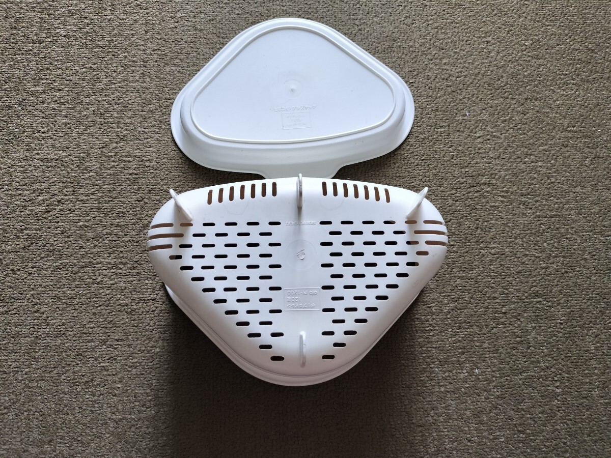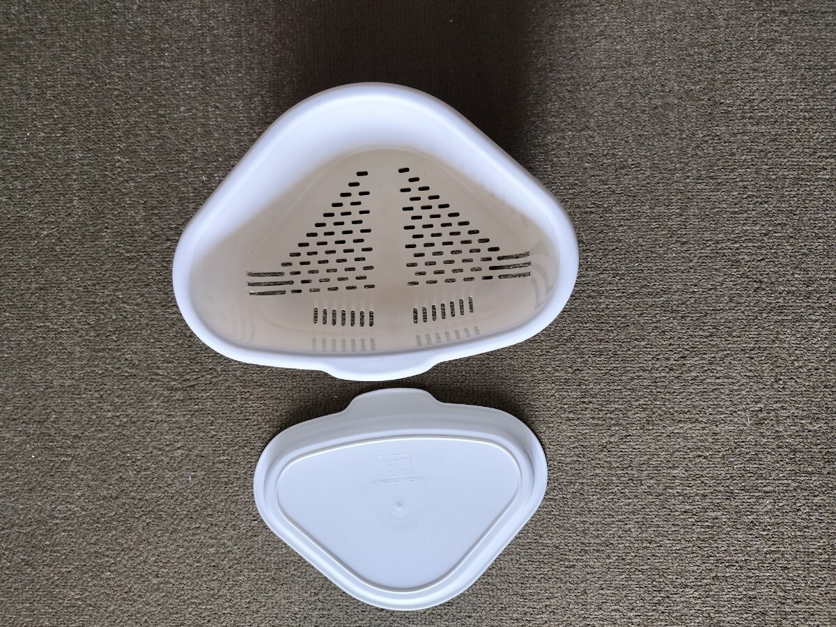 セキスイの三角コーナーです。ポリプロピレン製で、120度耐熱タイプです。シンクや風呂場での使用を想定した形状です。