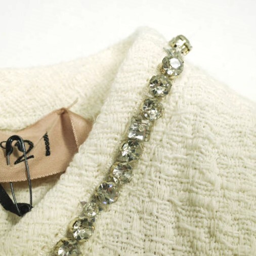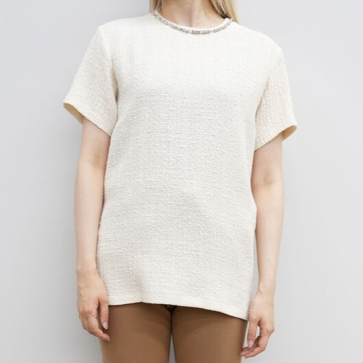 こちらはクルーネック部分にビジューデザインをあしらったブラウスです。