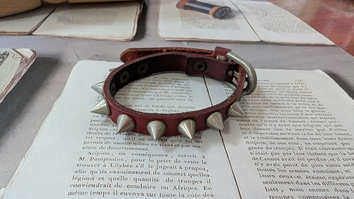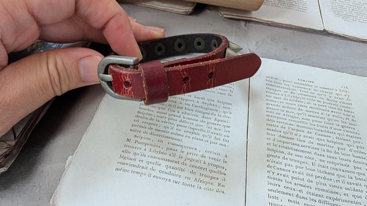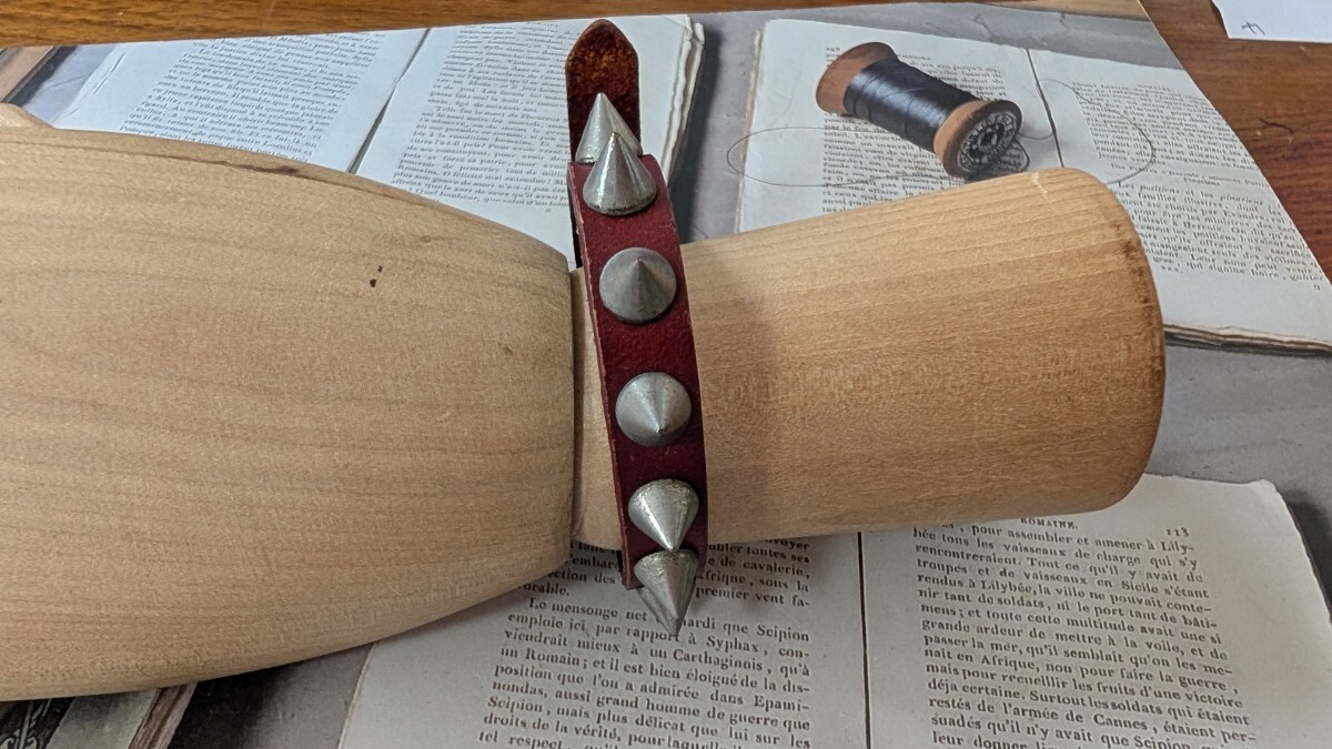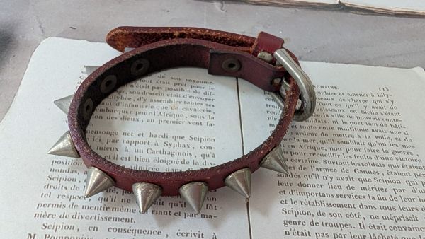パンクな印象 エンジ系レザー&スタッズ バングル