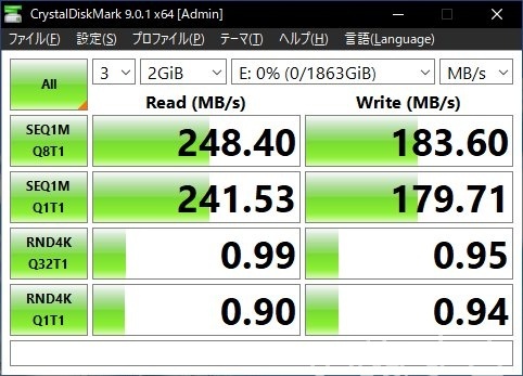 使用時間の若いディスクでRAID構築後、テストとしてCrystalDiskMarkを回して異常のないことを確認しました。