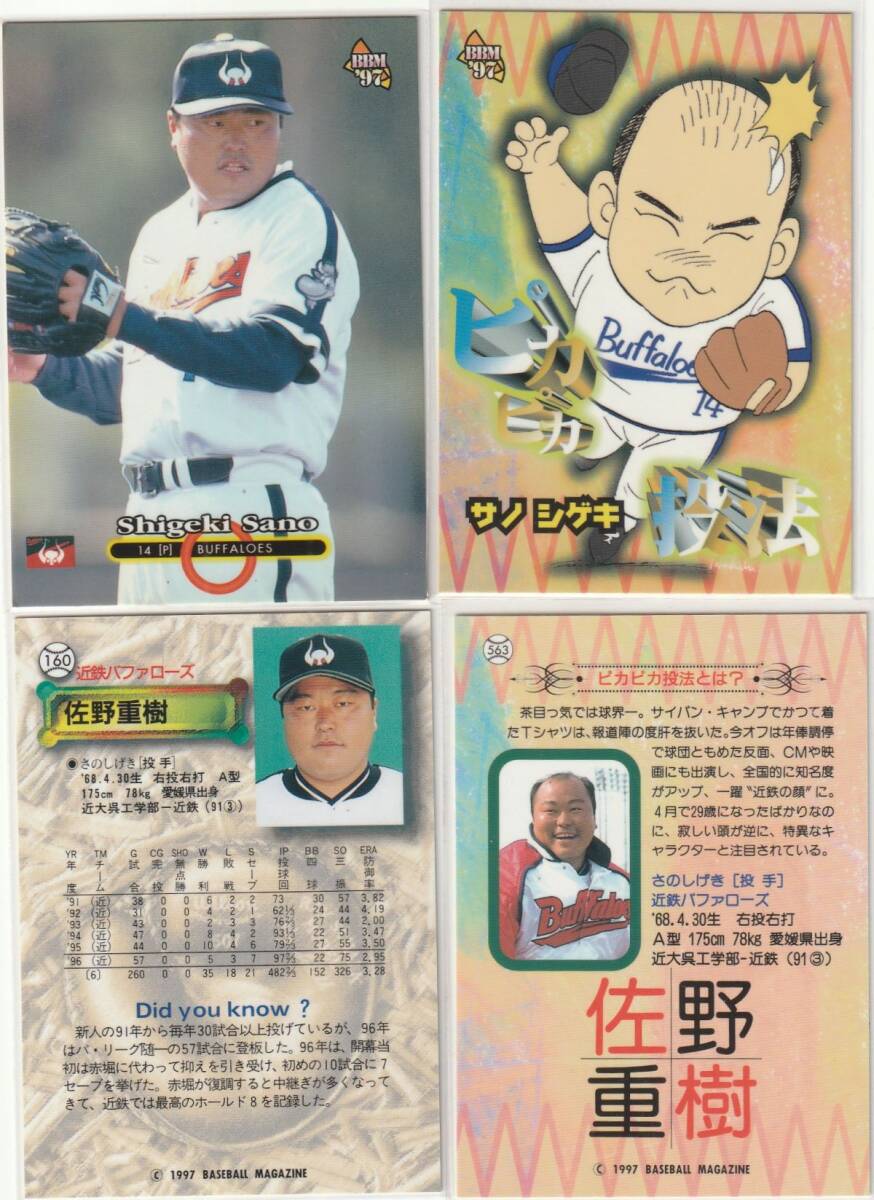 ●1997BBM【佐野 重樹】レギュラー&サブ版:ピカピカ投法 2種セットNo.160&563:近鉄 R2