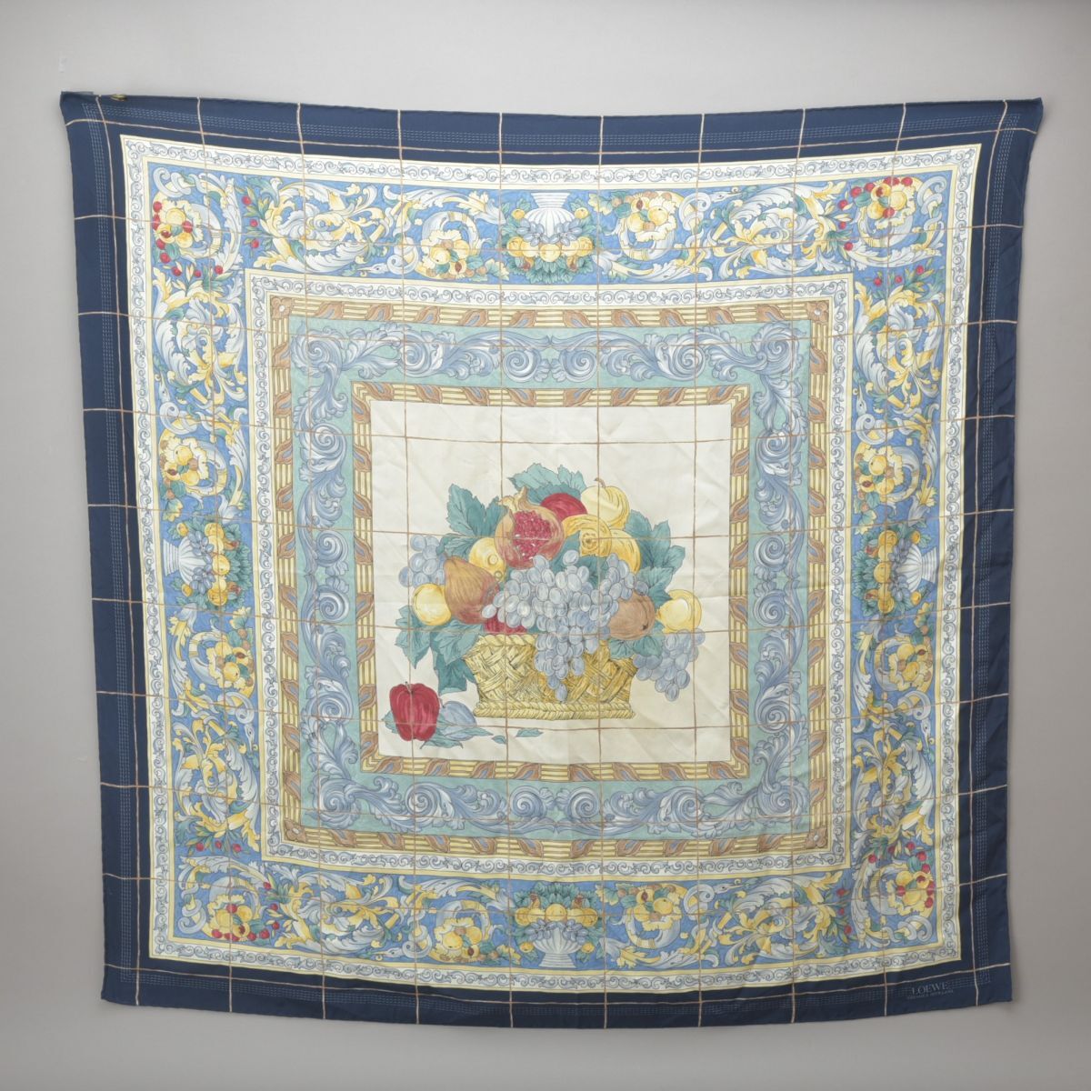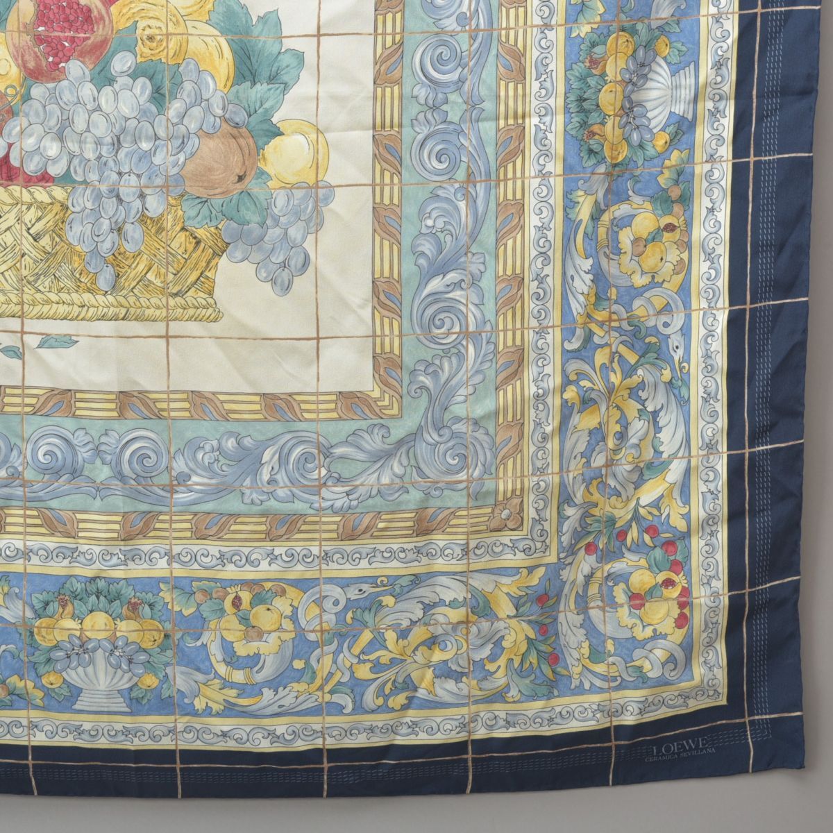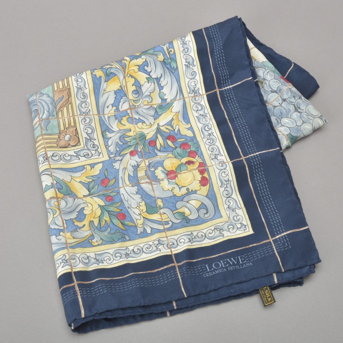 極美品 ロエベ LOEWE スカーフ セビリアの陶器 86×86 ブルー フルーツ CERAMICA SEVILLANA ストール ショール シルク #N※0724-12