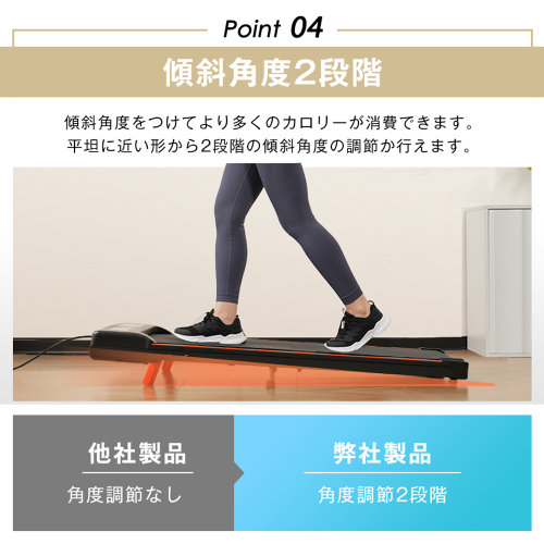 • 【傾斜角度2段階】傾斜角度をつけてより多くのカロリーが消費できます。平坦に近い形から2段階の傾斜角度の調節か行えます。