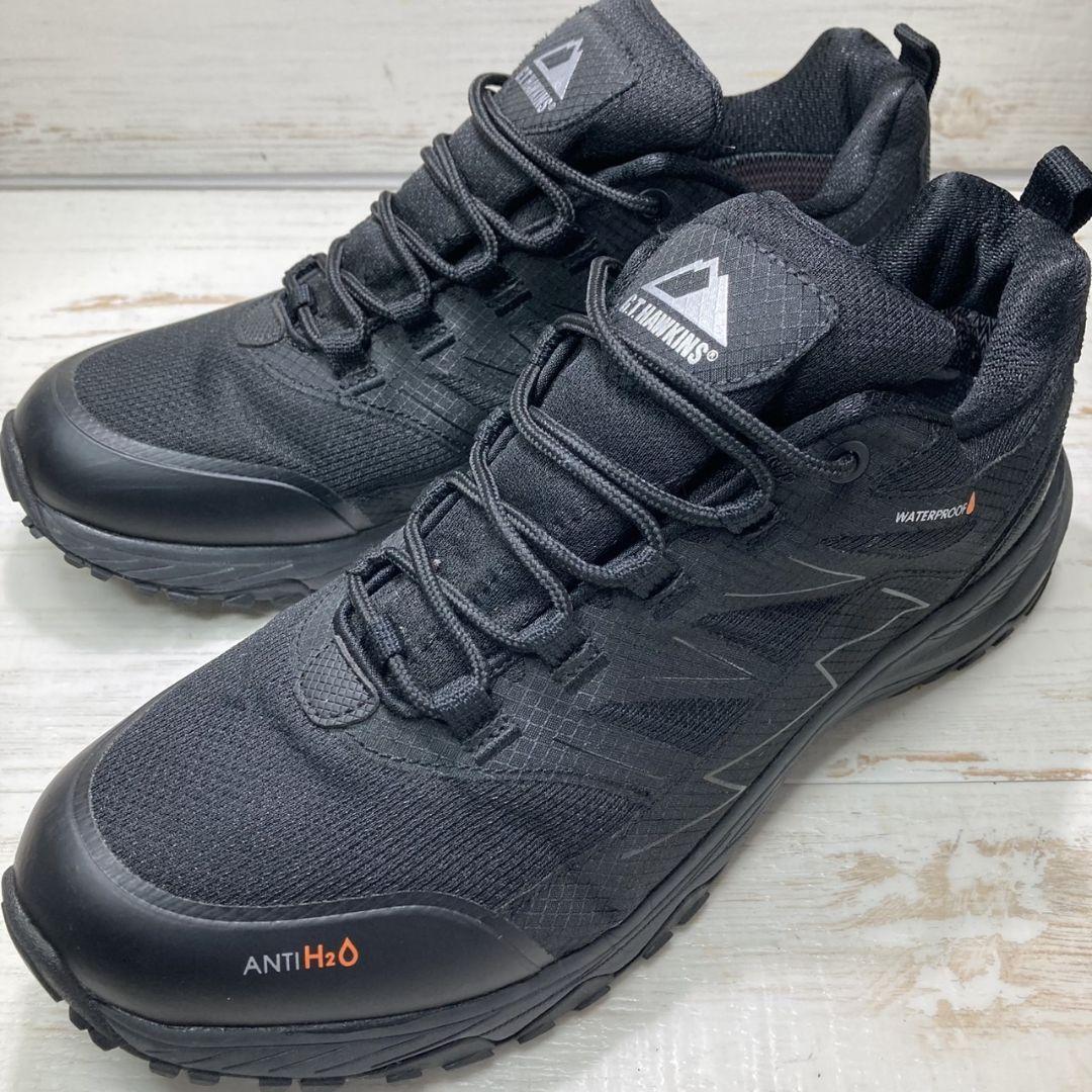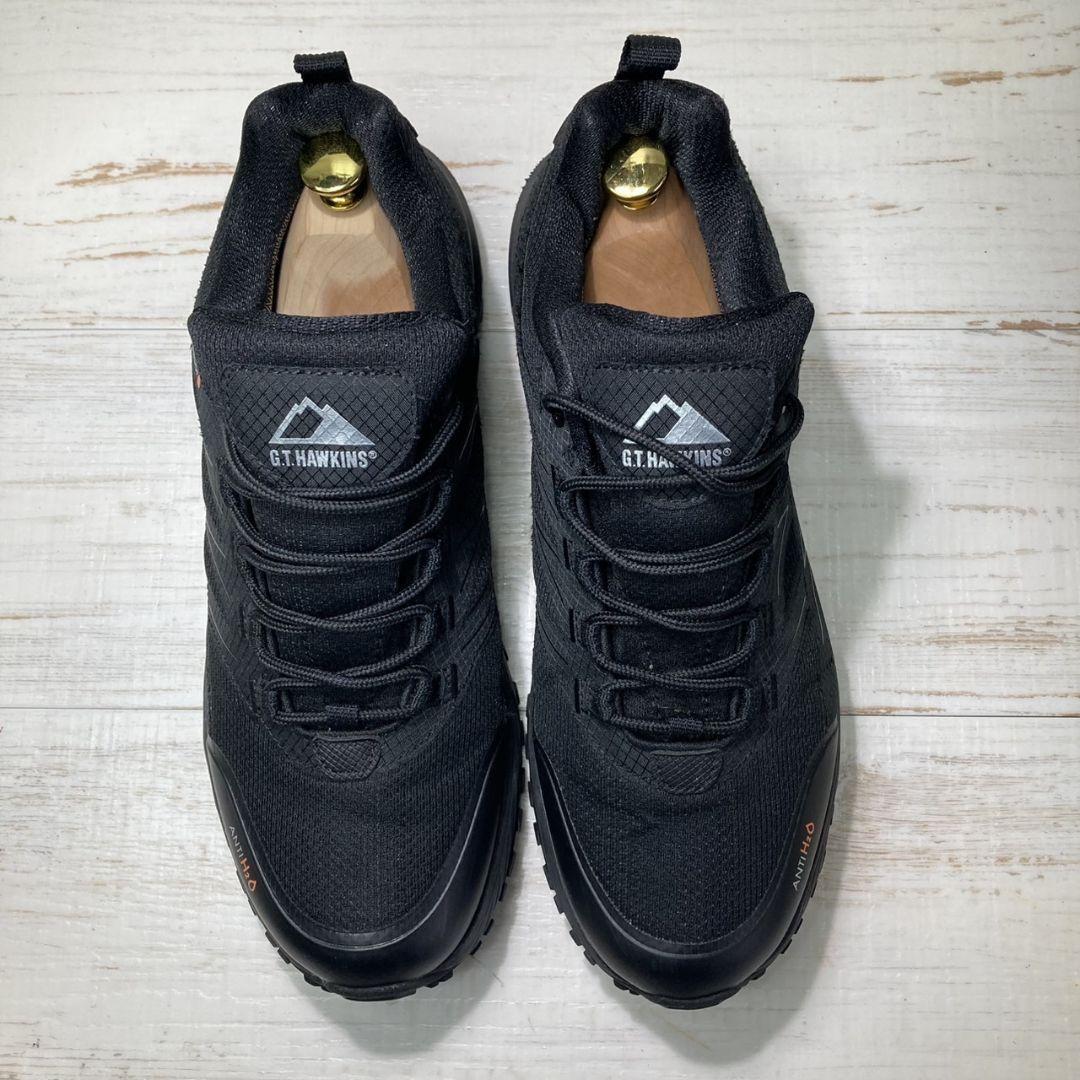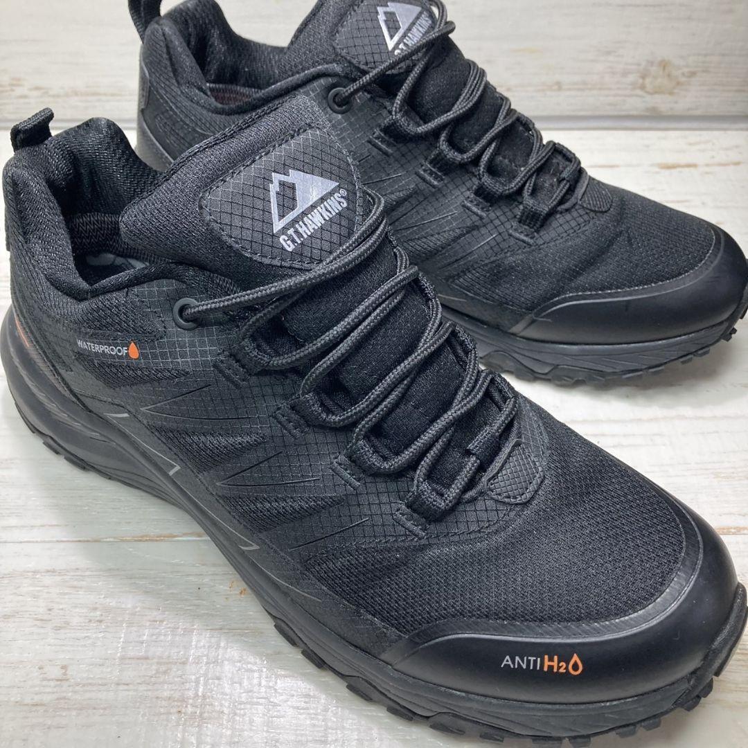 GTホーキンスのブラックスニーカーです。防水仕様「WATERPROOF」や「ANTI H2O」表記があり、アウトドアや雨の日でも安心して履ける機能的な一足です。シンプルなデザインながら、しっかりとしたグリップ力のあるソールで安定感があり、長時間の歩行やアクティブシーンにもおすすめです。