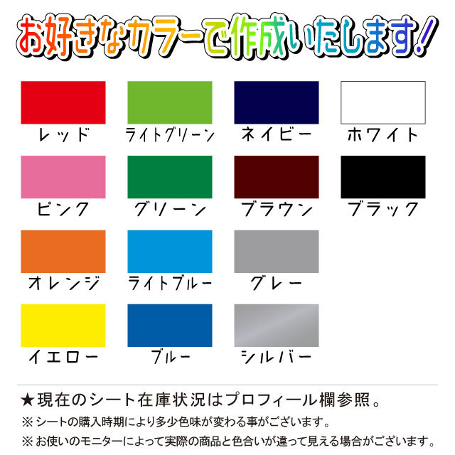 ※出品者情報欄の「出品者のその他のオークションを見る」より是非ご覧ください (出品リスト内で「猫」と検索でネコ系のデザインがピックアップされます)。 ★ご落札後、ご希望カラーをお教え下さい★ 当方のステッカーは文字や図柄だけが残るカッティングステッカーで、何もない部分は貼り付けた場所が直接見えます。 シーンや目的・用途に応じたご要望にお応えするため、商品画像のカラー以外にも、カラーバリエーションをご用意いたしました。 ご落札後、ご希望カラーの確認をさせて頂きます。 ※現在、作成可能なカラーは自己紹介欄にてご確認ください。 (出品者情報のghtha07800をクリック) 1枚での価格となります。 【ステッカー部分のサイズ】 縦 約8.1cm 横 約15.5cm ☆ステッカーのサイズ変更ご希望の方は事前に質問にてご相談ください。 ・サイズに応じた追加料金が発生いたします。 ・短い方の辺が20cm、長い方の辺が30cmまで対応可能です。 ・縮小する場合は、デザインにより対応可能なサイズが異なります。また、縮小によるお値引き等は致しません。そのままの価格となります。 ※野外使用、4~5年程度のカッティングシートを使用しております。 他にもステッカーを出品しております。 出品者情報欄の「出品者のその他のオークションを見る」より是非ご覧ください。 ★☆★ステッカー3点以上のお買い上げをいただいた場合、送料無料★☆★ 同時落札いただいた場合は同梱発送をさせて頂きますので、是非、併せてご覧いただければと思います。 ---貼り方--- 1、貼り付ける位置を決め、汚れや付着物等を綺麗に落としてください。 2、透明シートに図柄が全て乗っている事を確認しながら、ゆっくりシートごと台紙から剥がします。 3、シートを貼りつけ、布などでシートの上からしっかりこすりつけます。 4、透明シートをゆっくり剥がすと、図柄や文字部分のみ残ります。 | ||||